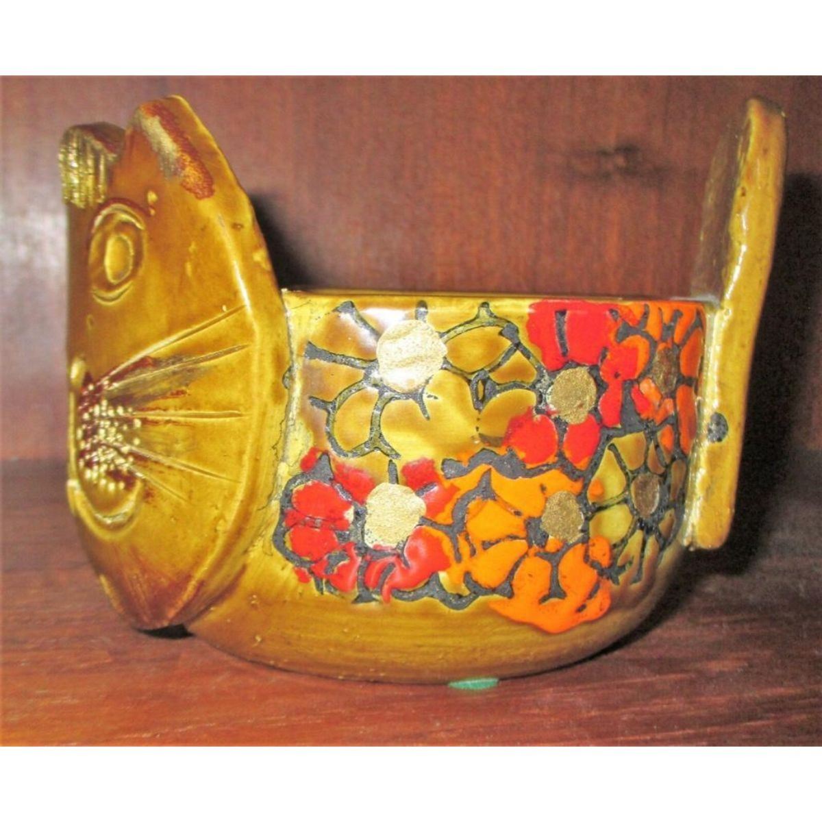 Rare & seldom seen mid century modern Bitossi for Rosenthal Netter figural cat dish/ bowl with original Rosenthal Netter label still attached. Signed 67/9A Italy. Flower design painted in wonderful vintage colors - orange, gold & red on each side, the face trimmed in gold. Measures roughly 5" diameter.Â