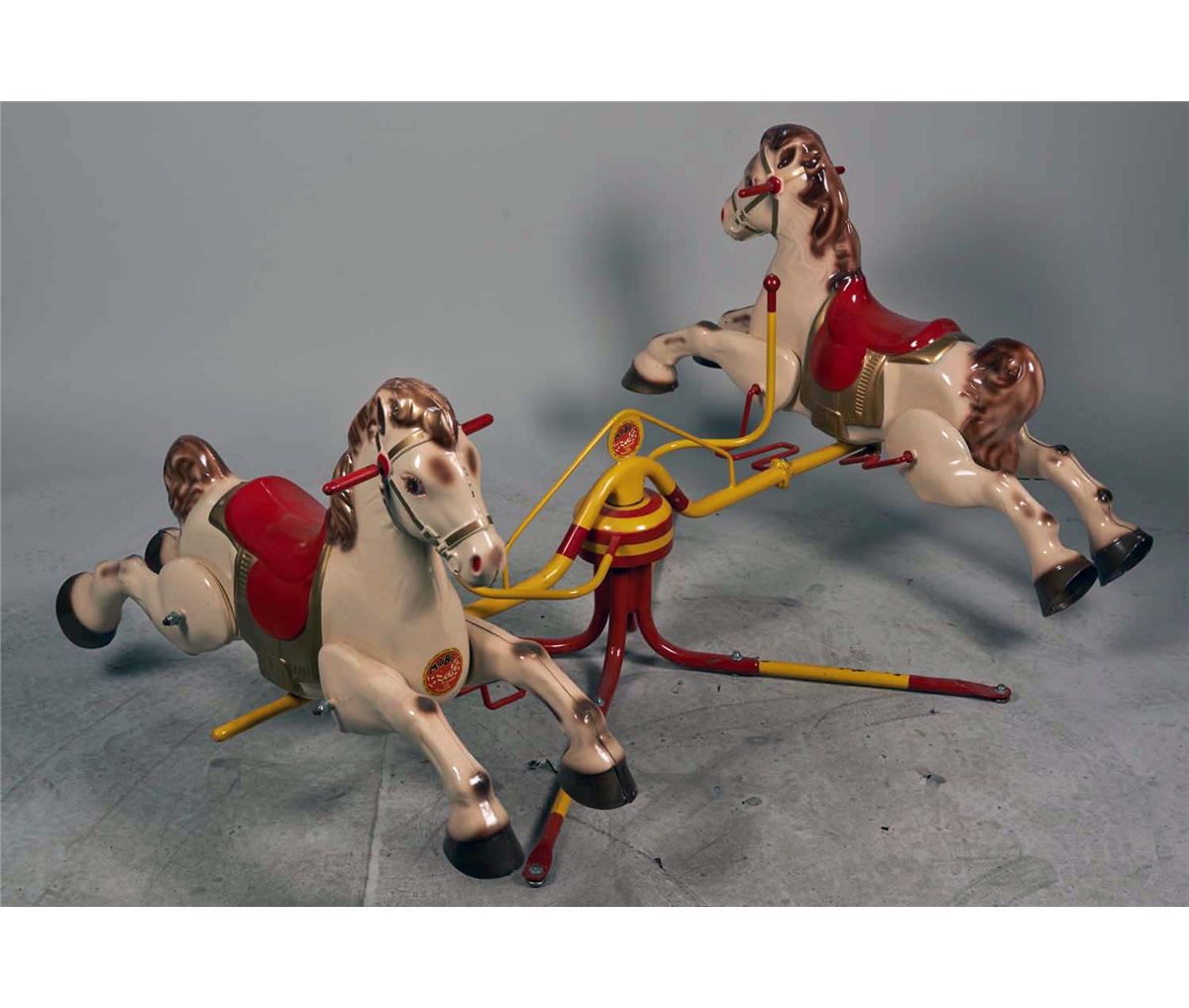 Has two horses with red and yellow spinning base and floor mounts. Sold by Sebel Products Ltd. London and New York. Condition (Very good). Size 45" Base & 48" Between Horses.