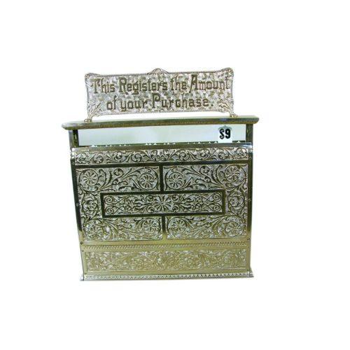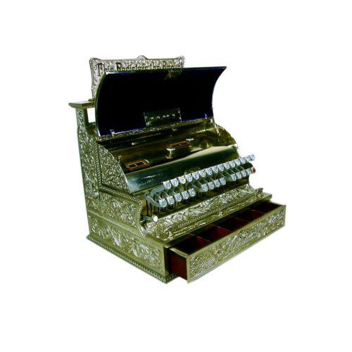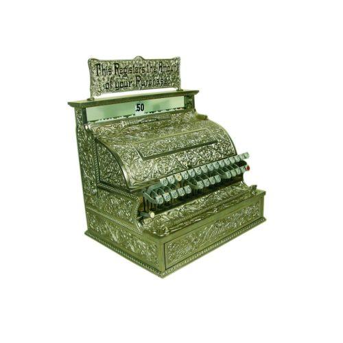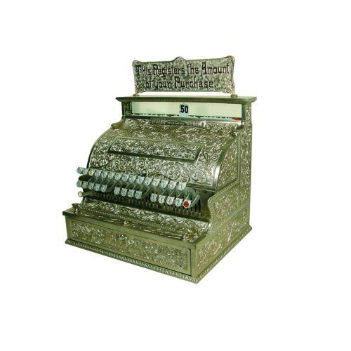 Rare Model 335 1/2 National Cash Register from the NCRs Archives Department. Sold in 1899 to H. Schienewe of Paterson, N.J. by H.H. Gerrish, Newark, N.J. This is a prototype machine made with a special entry correction system which was never adapted in NCRs registers. It is a chicken scratch nickled cabinet with a rare lion rail and Bensinger front facing keys. Equipped with a reproduction matching marquee.