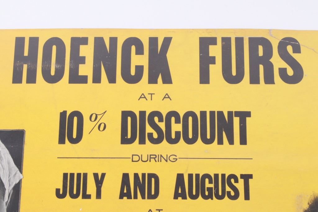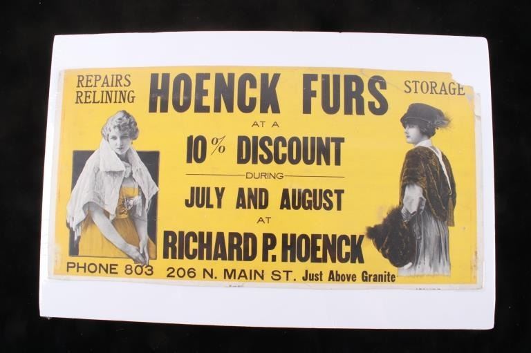 For your consideration this lot includes a Rare Original Butte, Montana Streetcar Advertising Sign for Hoenck Furs, circa 1925 (streetcar service ended in 1937 with the advent of buses), an early piece of Butte, Montana history. The sign reads, "Repairs Relining Hoenck Furs Storage at a 10% Discount during July And August at Richard P. Hoenck Phone 803 206 N. Main ST. Just Above Granite", early photographs of two women wearing furs are at opposite ends of the sign from left to right. Hoenck was the pioneer furrier during Butte's heyday as the "Richest Hill on Earth". The sign was part of an extensive advertising business known as Street Railways Advertising Co., an affiliate of Consolidated Street Railway Advertising Company. The company was founded by Barron G. Collier, the "father of streetcar advertising", and by 1925 became the largest advertising company in the world. Collier's type of advertising cards are still found on public transportation today!