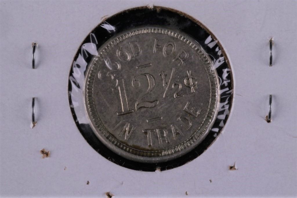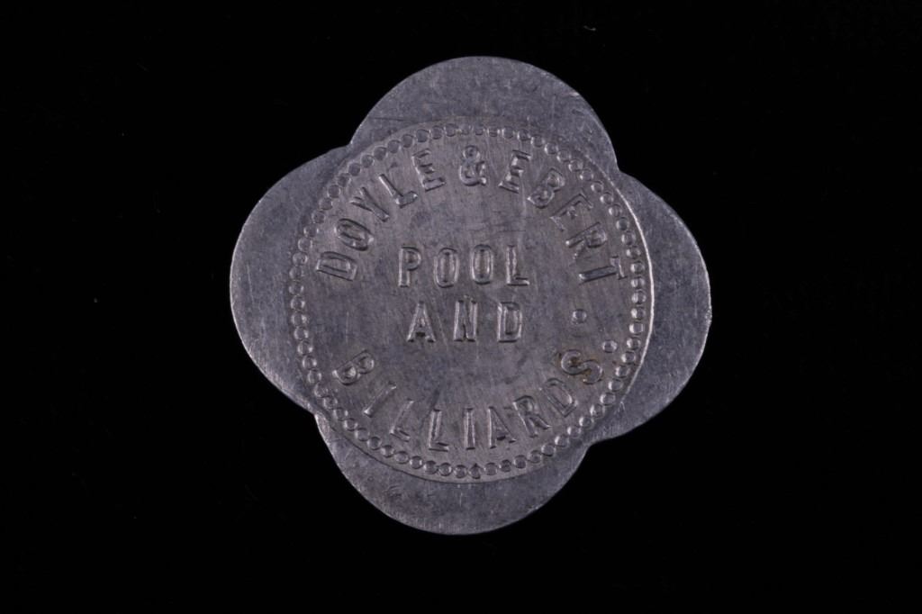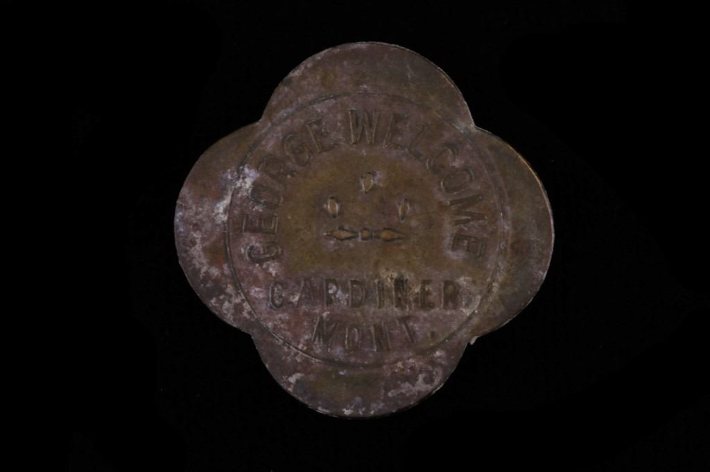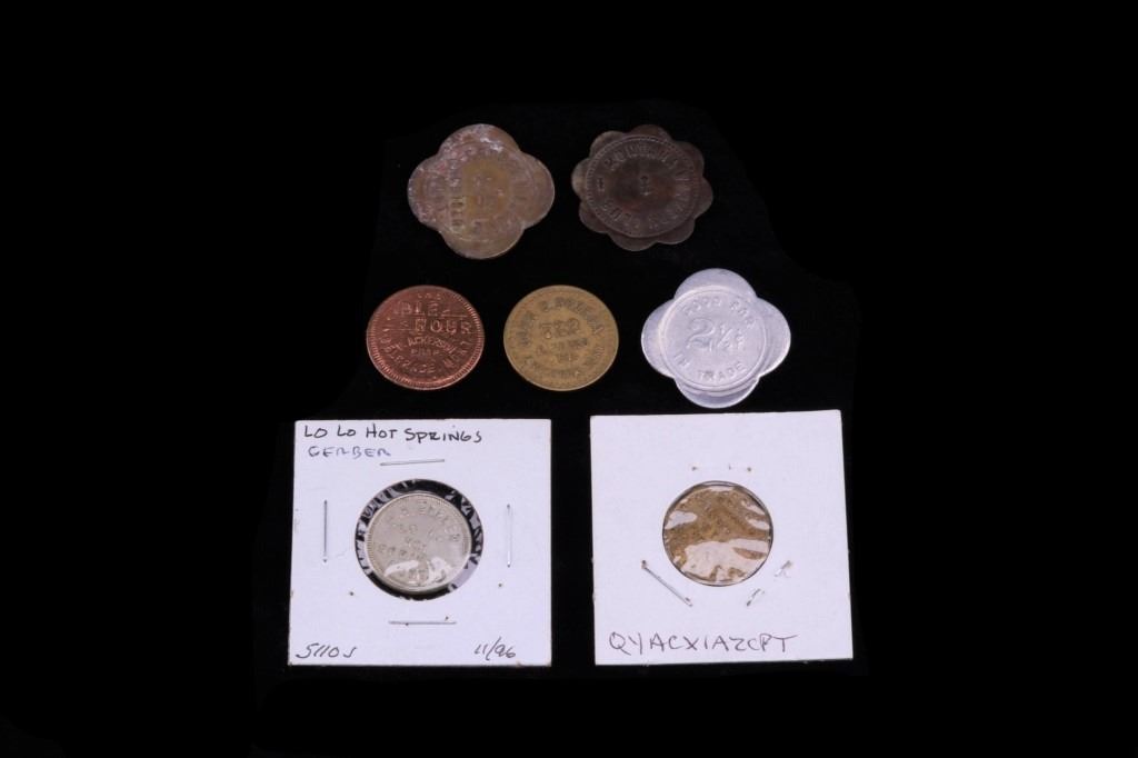 In this lot is a very rare collection of Montana trade tokens. There are seven tokens in this collection. The first token is from Lolo Hot Springs with P. H Gerber's name on it and has a value of 121/2 cents. Gerber owned the hot springs starting in 1903. The next token is for S.P. McDonald Montana Bar Hot Springs Montana 5 cents. The next token is from John B. Pozega Anaconda, Montana 10 cents. The next token is copper and from the Idle Hour F. Ackerson Belgrade Montana 5 cents. The next token is copper and has a rosette shape and is from Montana Workers Club for 10 cents. The Workers Club was in Red lodge, Montana and opened in 1909 and the building still stands today as The Carbon Country Historical Society & Museum. The next token is George Welcome Gardner, Montana 12 1/2 cents. The token is copper with a 4 leaf clover shape. Welcome was a saloon owner and businessman in Gardiner, which is just north of Yellowstone National Park, from the late 1800's until his death in 1905. This is a rarely seen token that is well over one hundred years old. The last token is from Doyle & Ebert Pool and Billiards for 2 1/2 cents. This token is also in the 4 leaf clover shape. The tokens range in size from 7/8" diameter to 1 1/8" diameter. All seven of these tokens are in good shape.