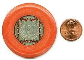 Grand Casino - World famous silvered center 100 Franc poker chip- the penny is for size reference and not part of the auction lot.