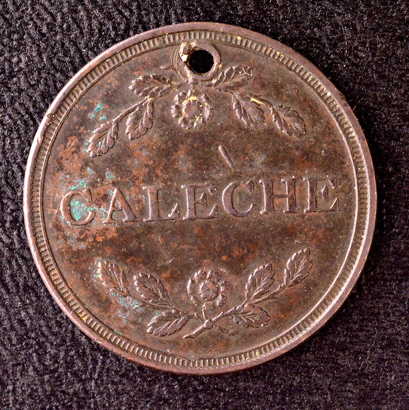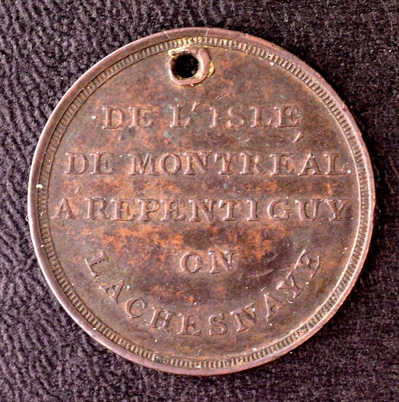 Bout De L'Isle, or Bridge token, Montreal, De L'Isle de Montreal à Repentigny ou Lachesnaye, or from Island of Montreal to Repentigny or Lachesnaye, good for Caleche, or Carriage, Br.538, BT-9, (1808). Good VF, but holed.