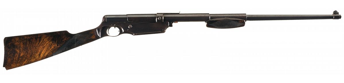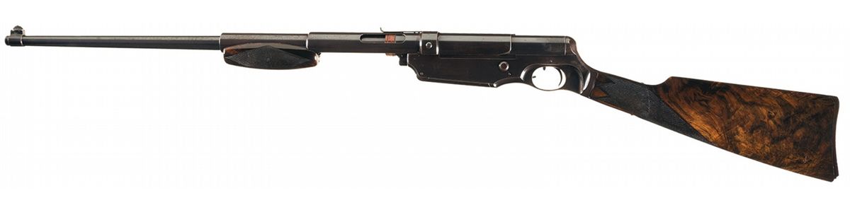 As with most Morris Smith prototype models, this rifle is unmarked except for the number "01" on the inside of the trigger guard. This unusual rifle features a rotary bolt design and while a variant, still the basic configuration of a Standard Arms Co. rifle. The exact date of manufacture is unknown, however characteristics would put it during the late Smith-Cordit Arms or early Standard Arms period of 1907-1910. Raised ramp front blade sight with an ivory bead and elevation adjustable rear sporting sight (elevator absent), hinged floor plate, all blue finish and mounted with a highly figured multi-point checkered walnut forearm and straight grip stock with a hard rubber buttplate. Comes with a copy of a patent diagram.