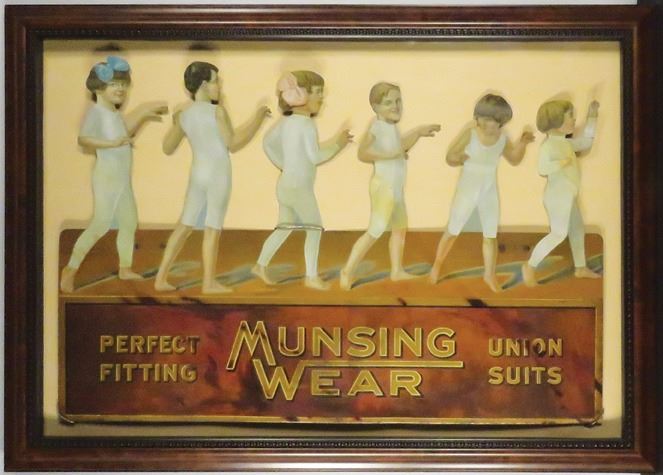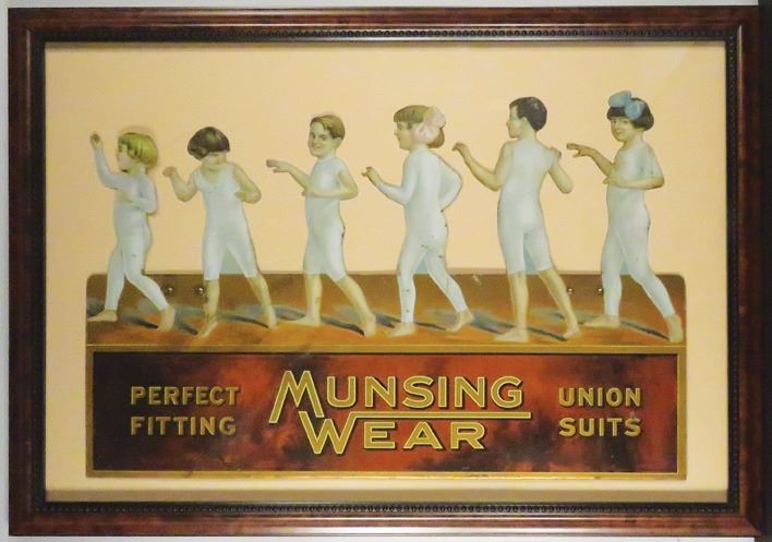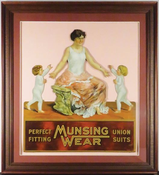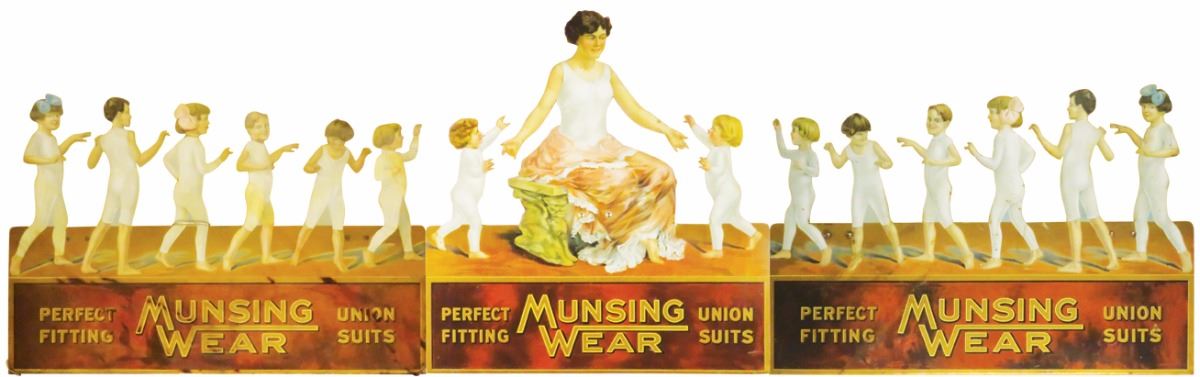 Rare Munsingwear Union Suits Die Cut Tin 3 pc. Store Display. Each piece framed under glass individually. Center piece has repair top center, some slight paint loss mostly to the left section of the 3 section sign. Does not dectract from overall image, very good condition. 68 X 20 inches overall.