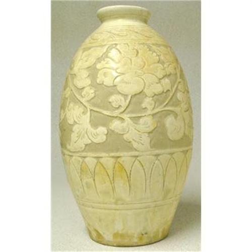 A rare and very fine Northern Song dynasty CiZhouYao with Sgraffito decoration and transparent glaze, ca. The dimensions are 11-3/4" tall by 6-3/4" widest. Prior to firing the leathery-hard clay body was carved and incised, in this case, with a scrolling peony design. Next a white or cream slip was applied, probably painted. As this process would have caused some of the slip to fill some of the carved and incised details, the details would have to have been "cleanup" or refreshed before the final clear glaze was applied and fired. This meiping has an unusual oval shape and ornamentation. This style of meiping and decorationg was typical of the Dengfeng potters in Henan province, Northern China. Above the shoulder, the meiping is decorated with a scrolling frieze and above the foot rim, it is decorated with incised lotus panels. The glaze stops unevenly just above the foot rim. The foot rim is thick and short with an unglaze rim. The center revealing the applied white/cream slip. The overall condition consensus is extremely fine condition, museum quality, without any injury, damage or repair.