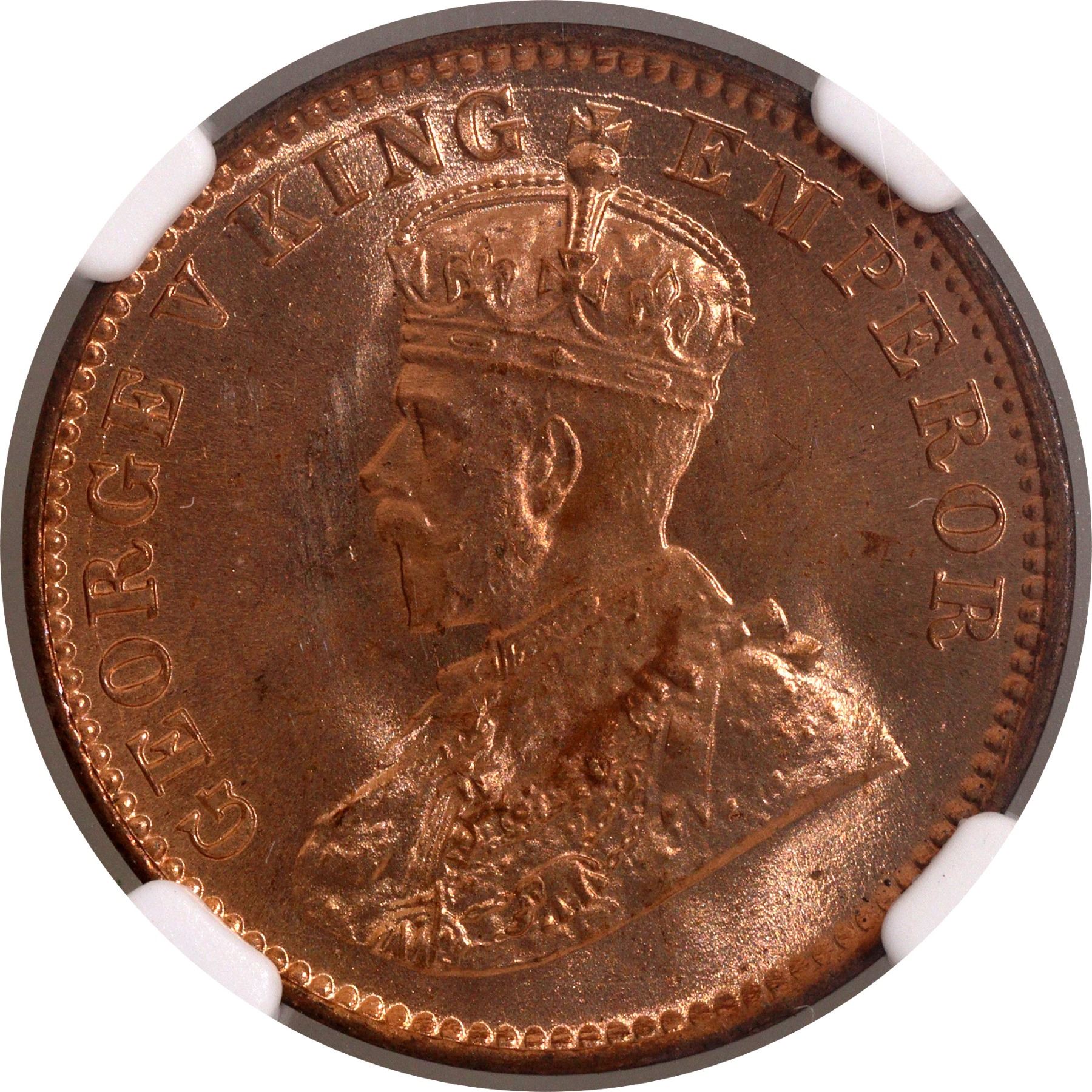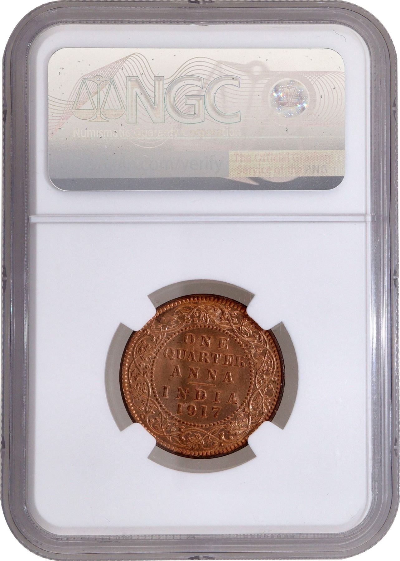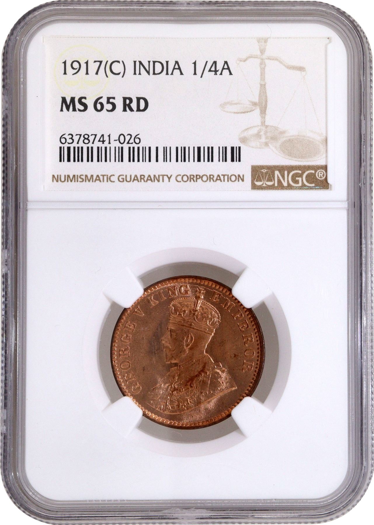 1917, King George V, Bronze ¼ Anna, Calcutta Mint, no dot, (PR # 662/GK # 1176), superb quality, strong features, graded & slabbed by NGC as MS 65 RD, Rare in this grade.