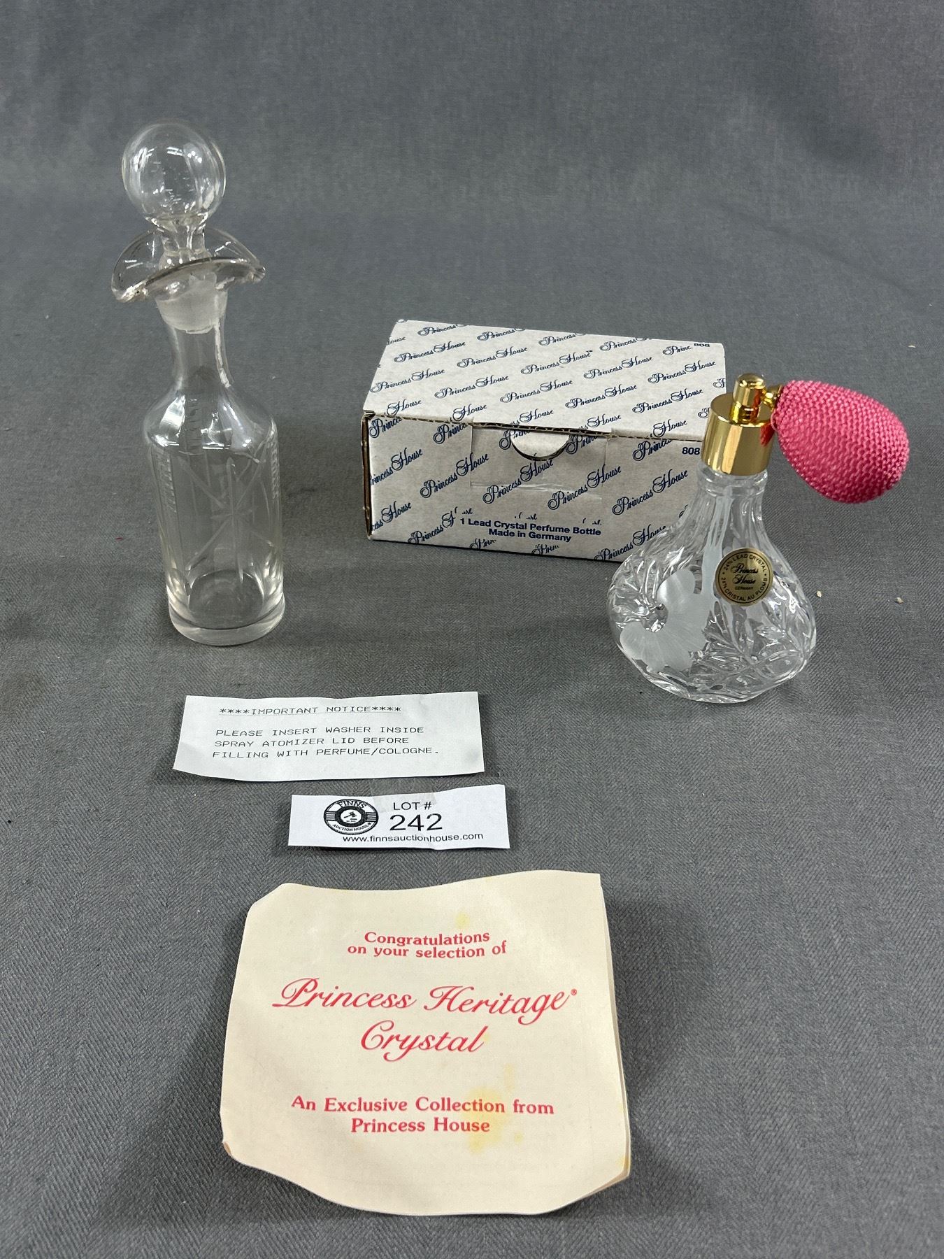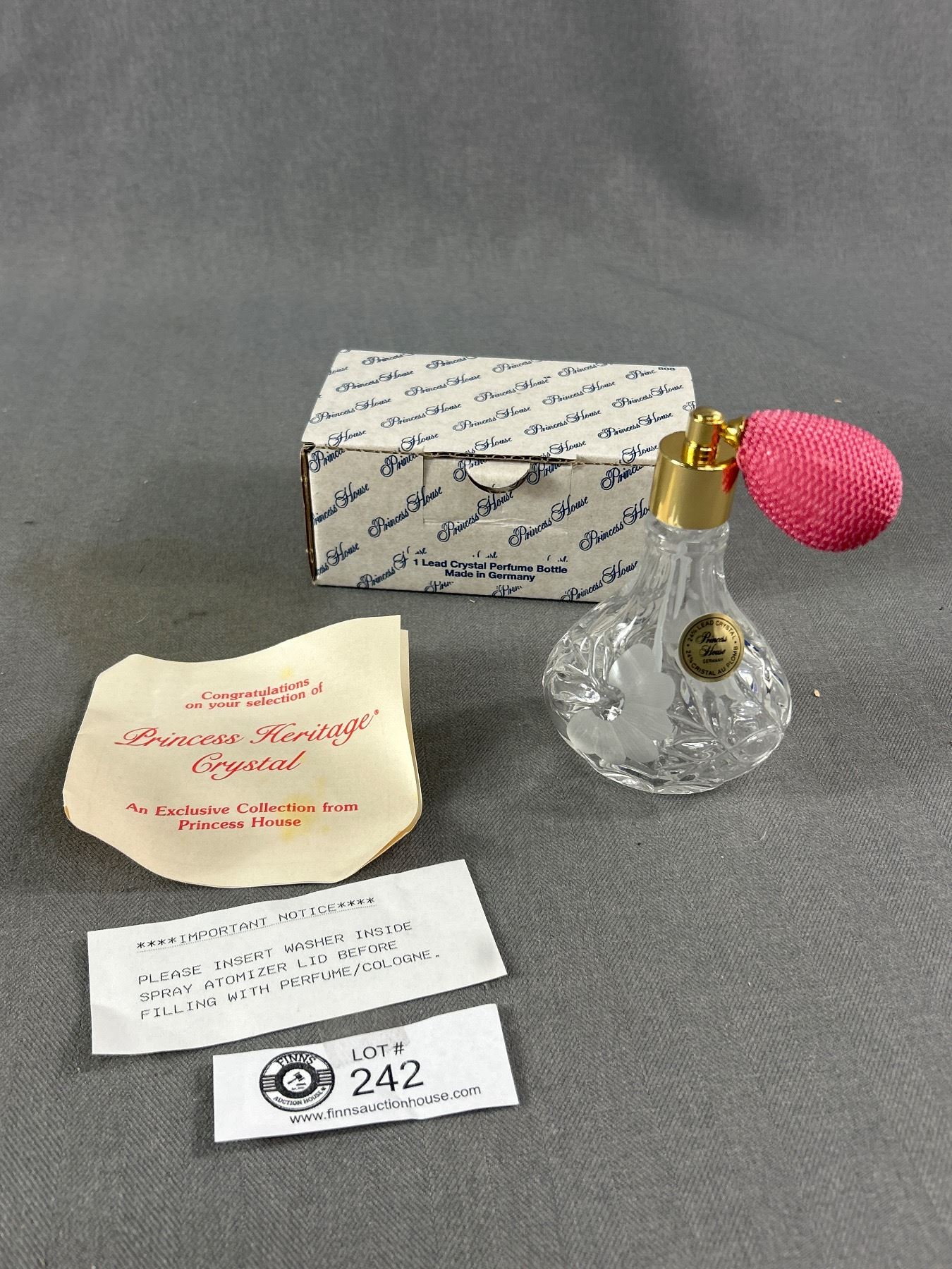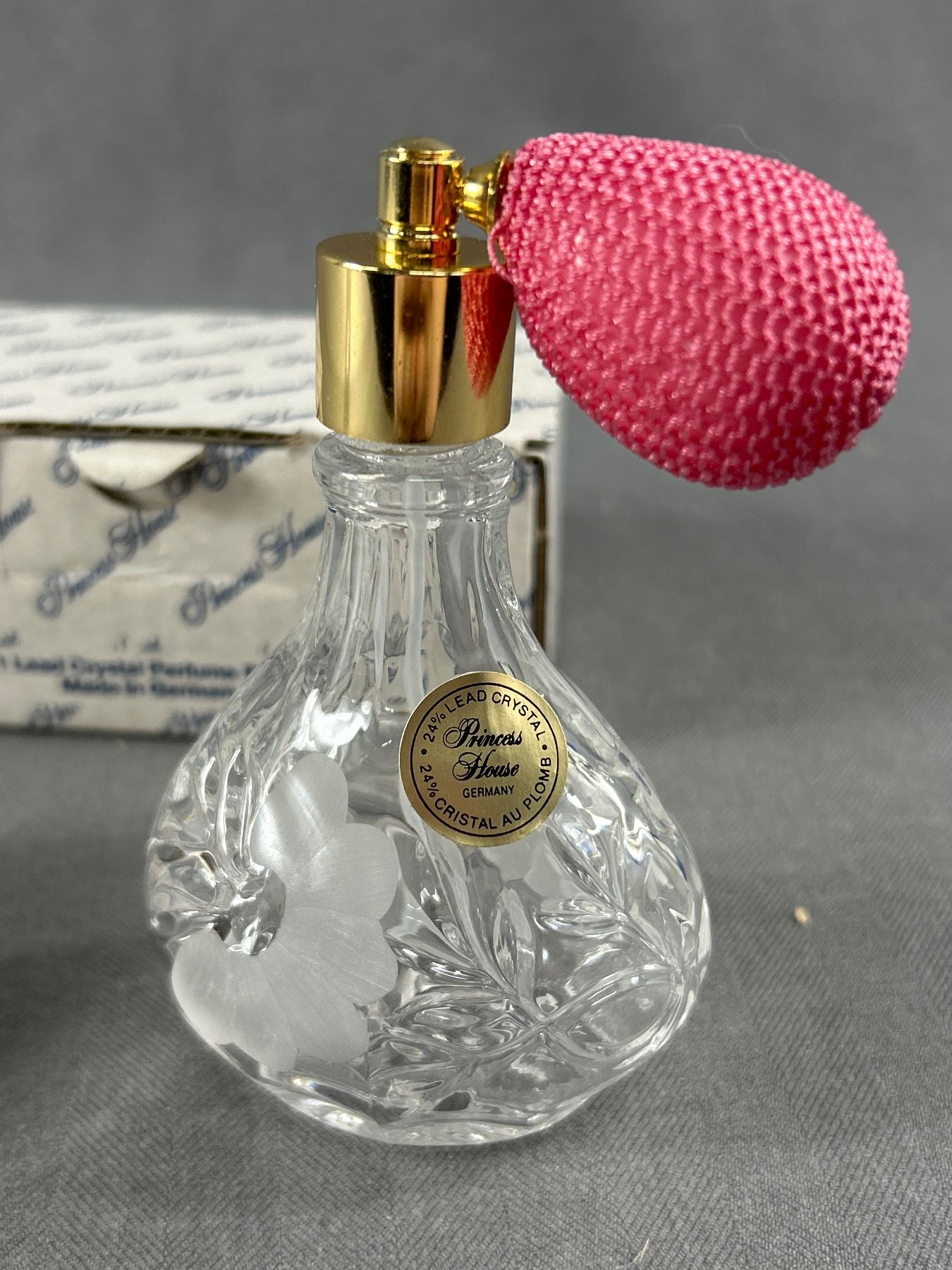 Rare NOS Vtg Princess House Etched Crystal Atomizer Perfume Bottle Germany Original Box & Instructions & 7" Vintage Bottle Org Stopper