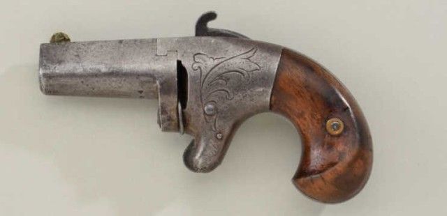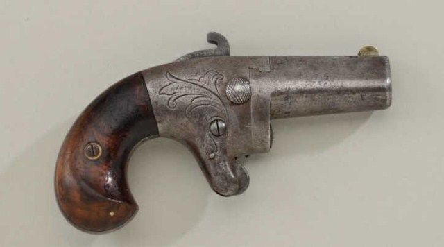 Rare National .41 caliber derringer with 2” barrel and iron frame one of only 200 estimated to have been produced. Serial #11594. The derringer remains in good original condition with a gray patina andjust normal aging. The barrel address is legible, the engraving is good, the grips are good with normal wear. The top of the hammer and release button are original. Made at the end of production. Est.; $800-$1,600