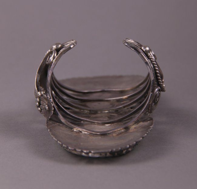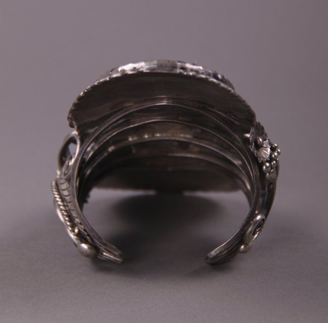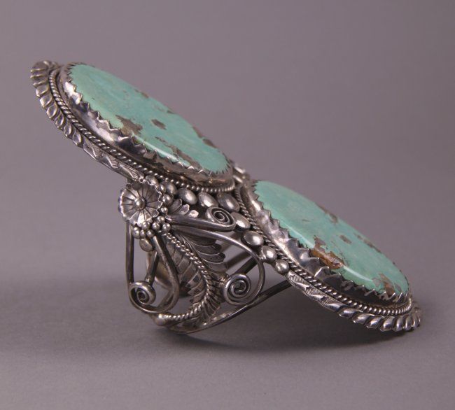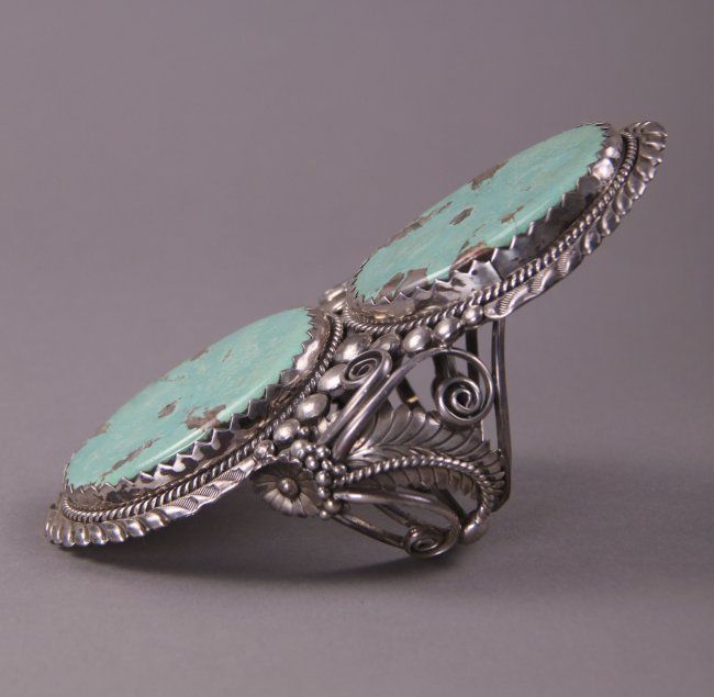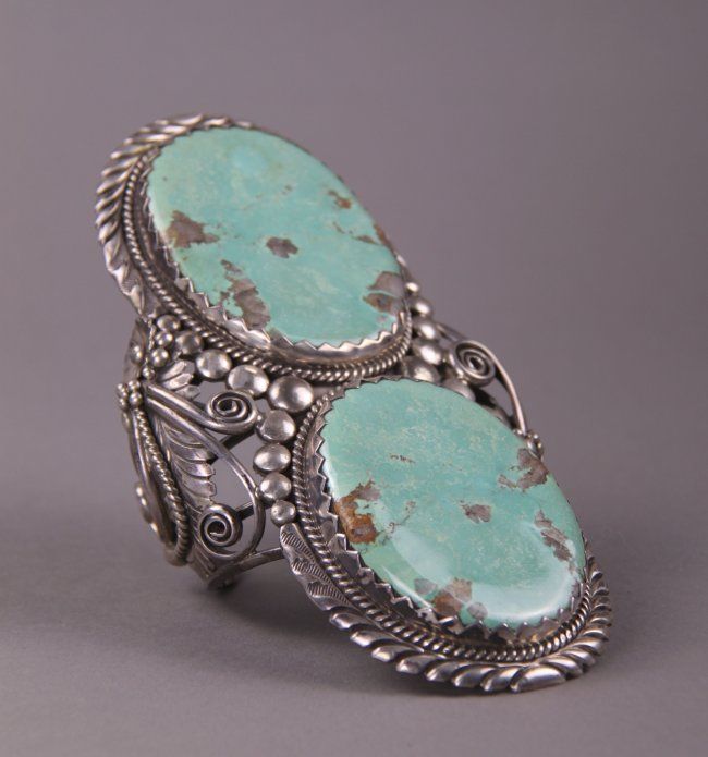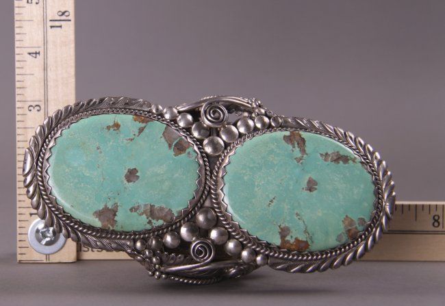 Rare Native American large Silver and Green Turquoise double stone bracelet with the highest quality of turquoise stones. Worn by the Chief of the Seminole Indians Joe Dan Osceola. Comes with C.O.A. Very large bracelet. X-ray Silver tested(Size: See last photo for measurement.) Photos are part of the description representing the condition report. Pangaea Auctions urges Bidder's to view all attached photos.