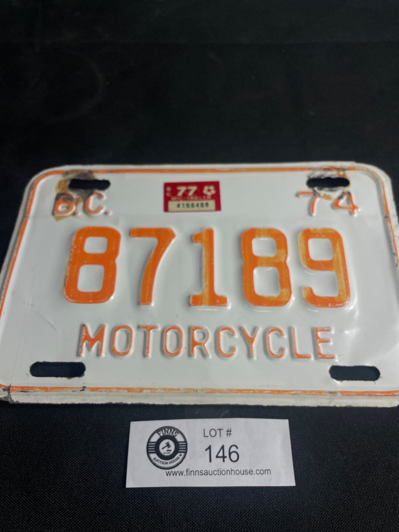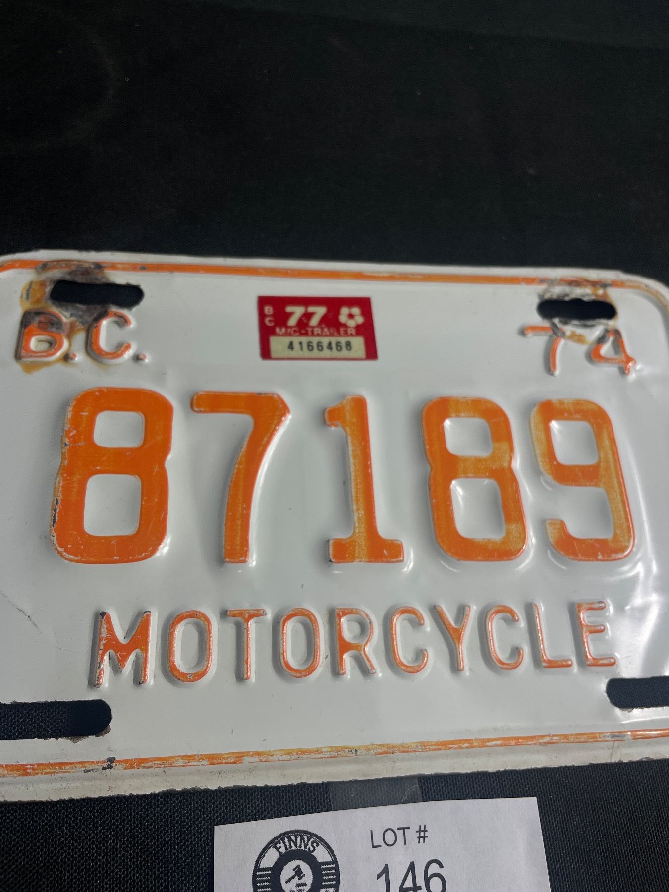 Rare Natural 1974 w/ 1977 BC Motorcycle License Plate