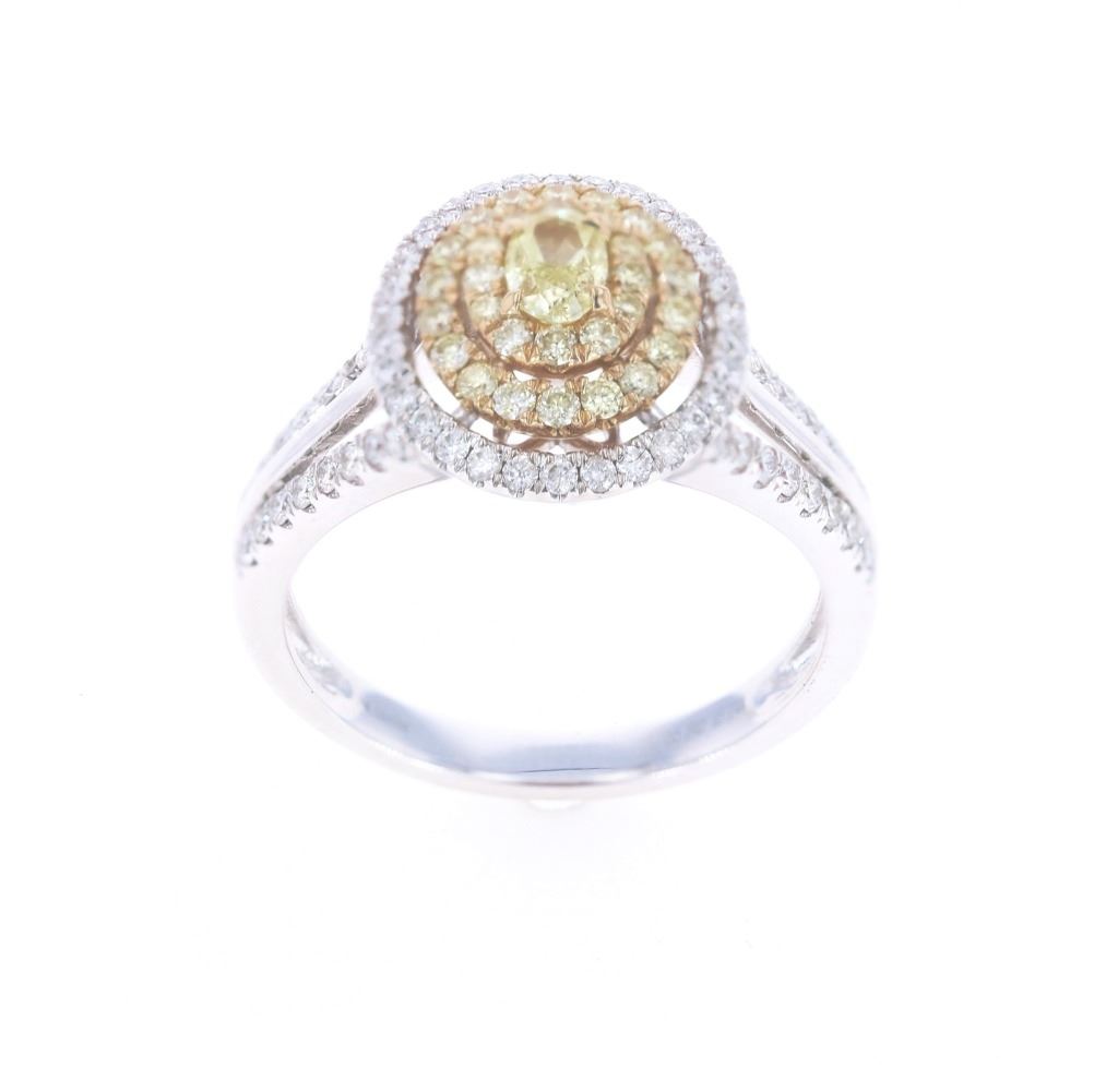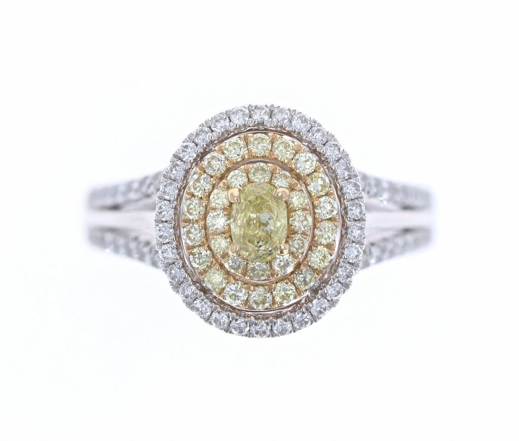 Featured in this lot is this rare, natural, fancy colored diamond and 14k white gold ring with AIG paperwork. The ring features an electronically tested 14k white gold ring band and features an 'Orianne' hallmark with a '14k' stamp next to the hallmark. The center stone is a prong set, oval shaped cut, fancy yellow diamond with measurements of 4.60mm x 3.20mm x 1.98mm, a weight of 0.24 carats, clarity grade of I-1, and fancy light-yellow coloration. The center stone features a three layers of halo decoration; the first two halo rings are decorated with a total of 30 prong set, round brilliant cut, fancy light yellow diamonds with measurements of 1.50mm - 1.30mm x 0.84mm, a total weight of .30 carats, a clarity of SI-1 to I-1, and fancy light-yellow color gradient. The last halo ring and split shoulders are decorated with a total of 66 prong set round brilliant cut diamonds and include measurements of 1.31mm - 1.20mm x 0.76mm, a total weight of 0.44 carats, a clarity of SI-1 to I-1, and color gradient of G - I. The total diamond weight is 0.98 carats. The piece comes complete with AIG (American International Gemologists, a GIA certified lab AIG Appraisal Number#: 000720035019) report and appraisal, confirming the above info and giving a total value of $5,550.00. The ring size is US 7.