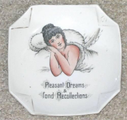 Extremely rare porcelain Naughty Nellie pin tray. Hand painted & xfer depicting an alluring Nellie laying across her bed. The mystery is in the discovery of the naughty part. No back stamp. 5.25"x5.25". (5-186)
