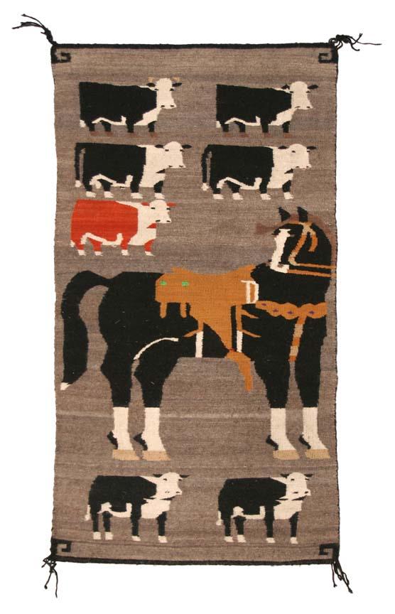 Rare Navajo Pictorial Weaving. 56" x 31". Wonderful pictorial designs depicting cattle & a saddled horse. Circa 1970s. (est $1,000-1,500). For condition reports please visit: www.auctioninsantafe.com/cr2011.pdf