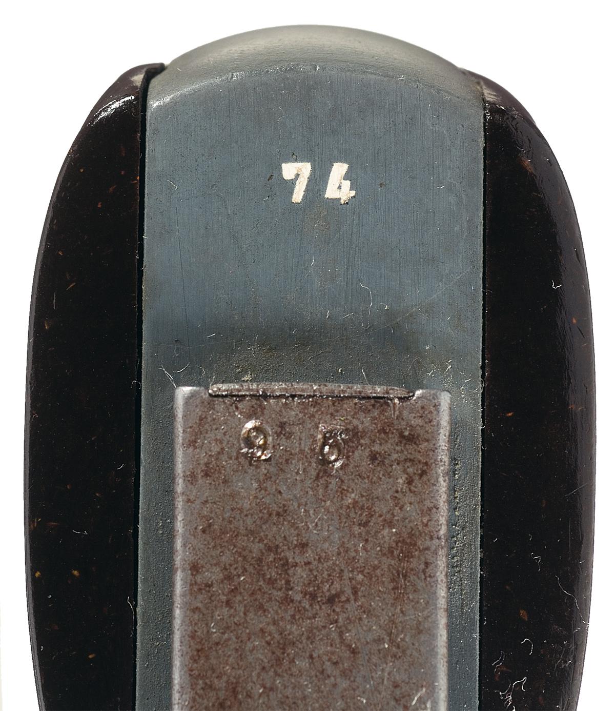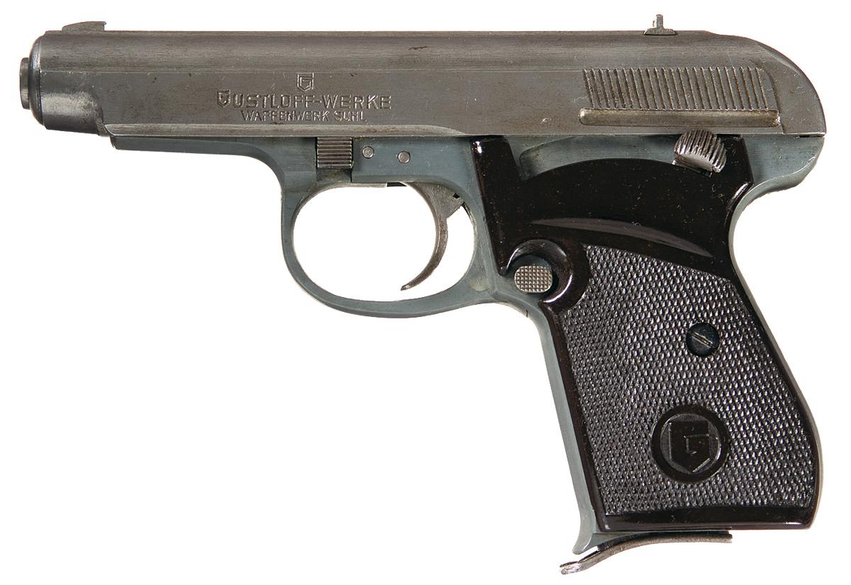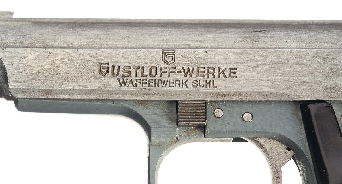This is a beautiful example of a super rare Gustloff-Werke experimental, double-action semi-automatic pocket pistol as developed in 1939. Development of the pistol was promoted by Fritz Sauckel, Gauleiter of Thuringia and founder of Gustloff-Werke. The pistol functions as a blow-back operated pistol with a steel slide similar in shape to the Walther PP models albeit with a completely internal hammer design (enclosed rear end of the slide) combined with a duraluminum frame similar to the Sauer Mod. 38 pistol. The pistol has sliding safety on the left side of the frame and frame-mounted magazine release. Documents that accompany the pistol indicated that in January 1940 a prototype was submitted to Adolf Hitler with the suggestion that it be adopted for use by the various police agencies, and that production could be accomplished at the old Weimar factory using slave labor from the nearby Buchenwald concentration camp. However, due to the outbreak of WWII and large numbers of both Walther PP and PPKs pistol already in use throughout the German military, no order ever materialized. Consequently, no production progressed beyond the experimental stage of development. It is estimated that fewer than 100 of these rare prototype pistols were ever manufactured, with this specific pistol being number "74" on the butt of the grip. There are shallow grip serrations on both sides of the slide. The top of the slide has a raised, serrated sight rib with a blade front sight and drift adjustable rear sight. The pistol has a flared grip strap and magazine floor plate. The left side of the frame is roll-stamped with a stylized "G" above the two-line legend: "GUSTLOFF-WERKE/WAFFENWERK SCHUL". The bright finished barrel chamber is stamped: "Kal.7.65 mm". It is fitted with a set of molded brown plastic checkered grips with the left grip having a large circled letter "G" molded into the left grip. It is complete with one steel magazine that is numbered "95"on the base plate. The steel slide is still in the white never having been blued, and so is the duraluminum frame.