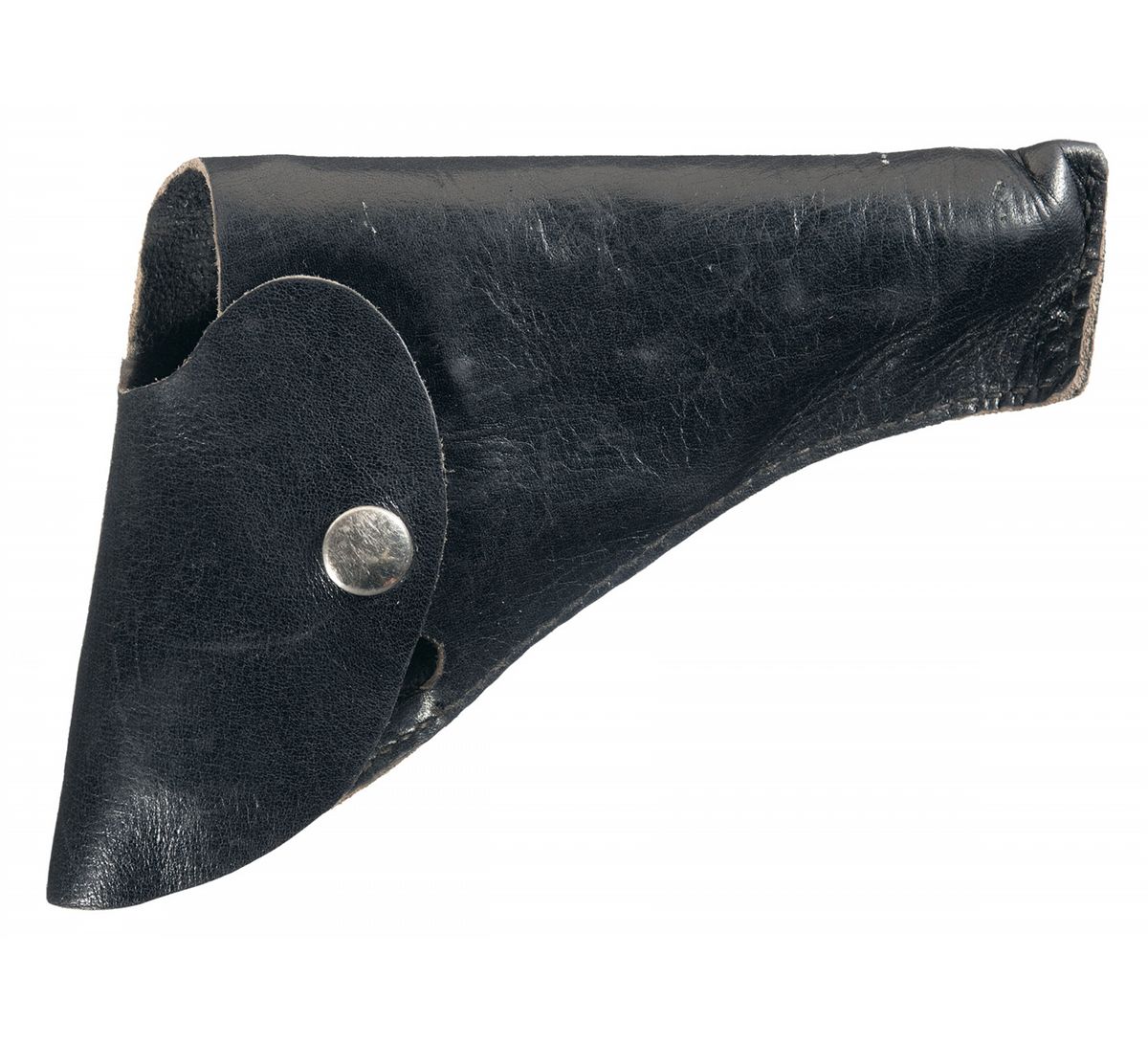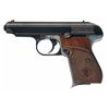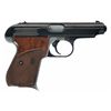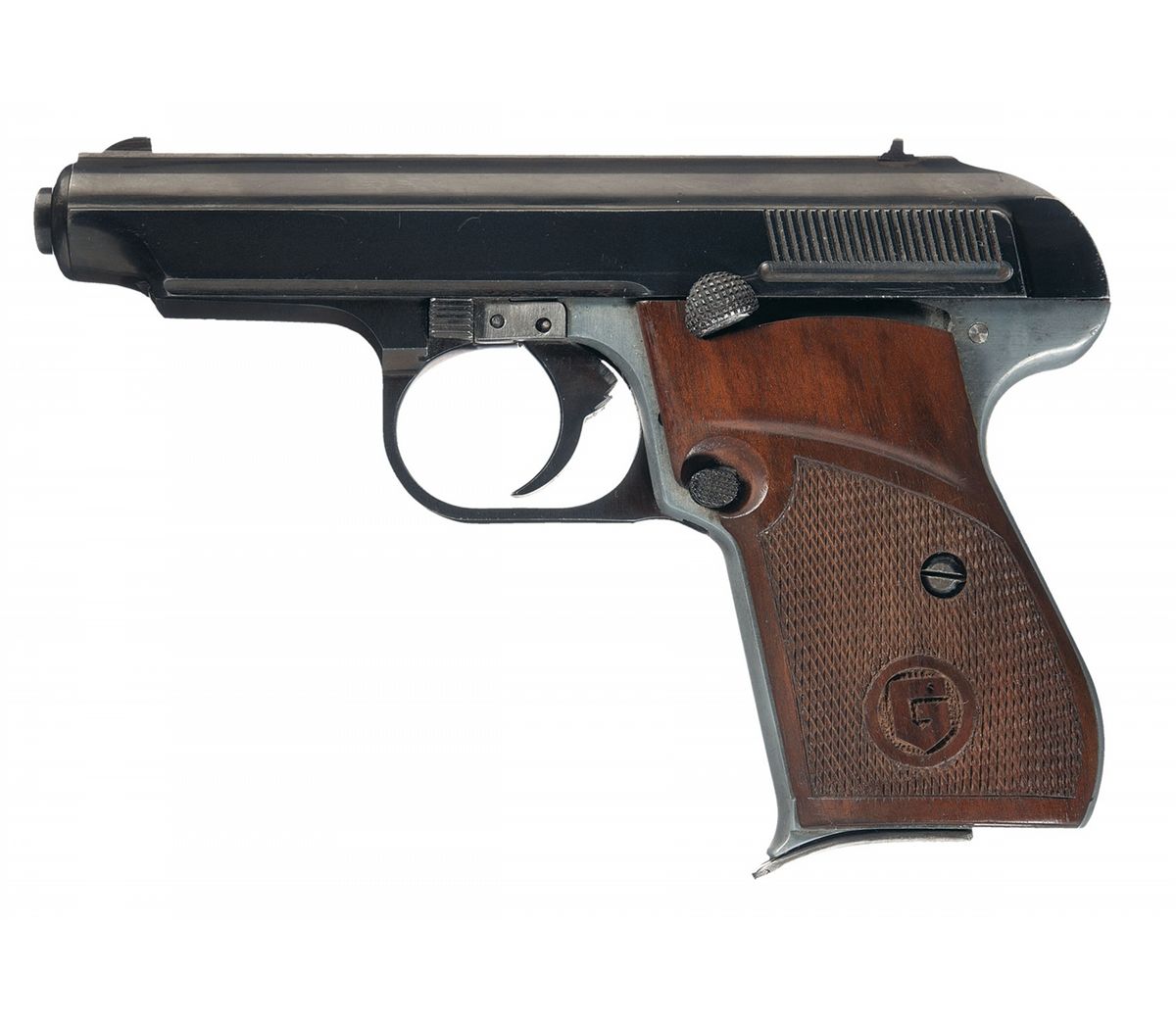 This is a excellent example of a super rare Gustloff-Werke experimental/prototype double-action semi-automatic pocket pistol as developed in 1939. Development of the pistol was promoted by Fritz Sauckel, Gauleiter of Thuringia and founder of Gustloff-Werke. The historical background on this rare pistol is that in January 1940 a prototype pistol was submitted to Adolf Hitler with the suggestion that it be adopted for use by the various police agencies, with production being at the old Weimar factory using slave labor from the nearby Buchenwald Concentration Camp. However, due to the outbreak of WWII and large numbers of both Walther PP and PPKs pistol already in use throughout the German military, no order ever materialized. Consequently, no production progressed beyond the experimental stage of development. It is estimated that fewer than 100 of these rare prototype pistols were ever manufactured, with this specific pistol being number "unnumbered" on the butt of the grip with the accompanying magazine being serial numbered "02", which may indicate that this example was the second model actually produced. The pistol has an all blue completely unmarked slide that has a raised serrated sight rib with a blade front sight and drift adjustable rear sight. The duraluminum frame is also void of any factory finish, still retaining it's original dull aluminum-gray color, certainly both are indications that this was a very early preproduction or prototype pistol. The pistol has an all blue unmarked or proof barrel. These pistols utilized a simple blow-back operation with a steel slide similar in shape to the Walther PP models albeit with a completely internal hammer design (enclosed rear end of the slide) combined with an all duraluminum frame similar to the Sauer Mod. 38 pistol. The pistol has sliding safety on the left side of the frame and frame-mounted magazine release. Two unique aspects of this rare pistol are that is has a two-piece frame with the front portion being a steel triggerguard that slides onto the front of the duraluminum frame and the other is that the safety and mainspring mechanism is actually inset in a simple steel stamped frame that is mounted on the back side of the left grip. Both concepts would certainly have increased production dramatically. It is fitted with a set of checkered walnut grips with a the lower-half of each grip panel being checkered with a large circled "G" on the lower left side. This pistol is accompanied by a simple post-war black leather flap holster with holster.