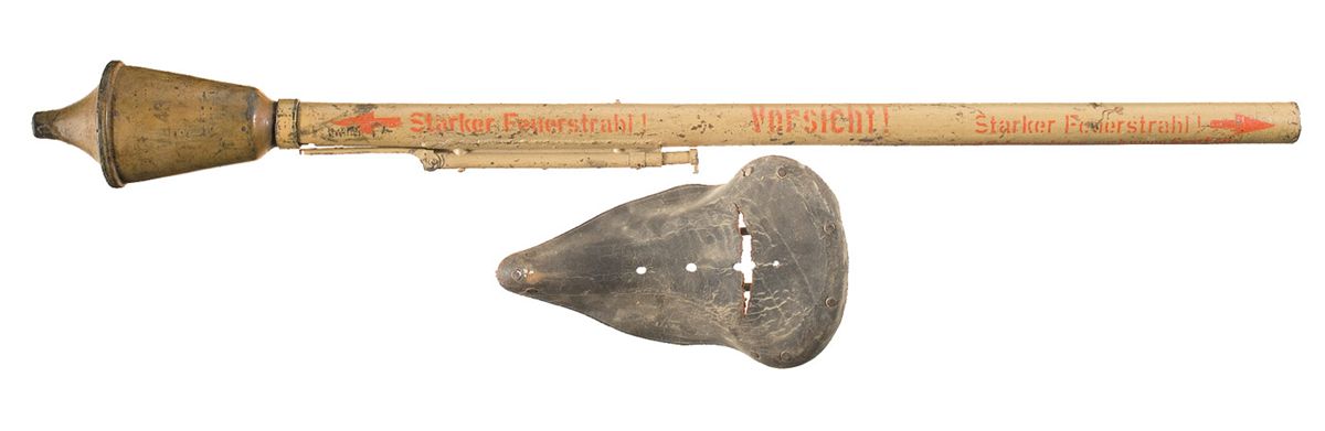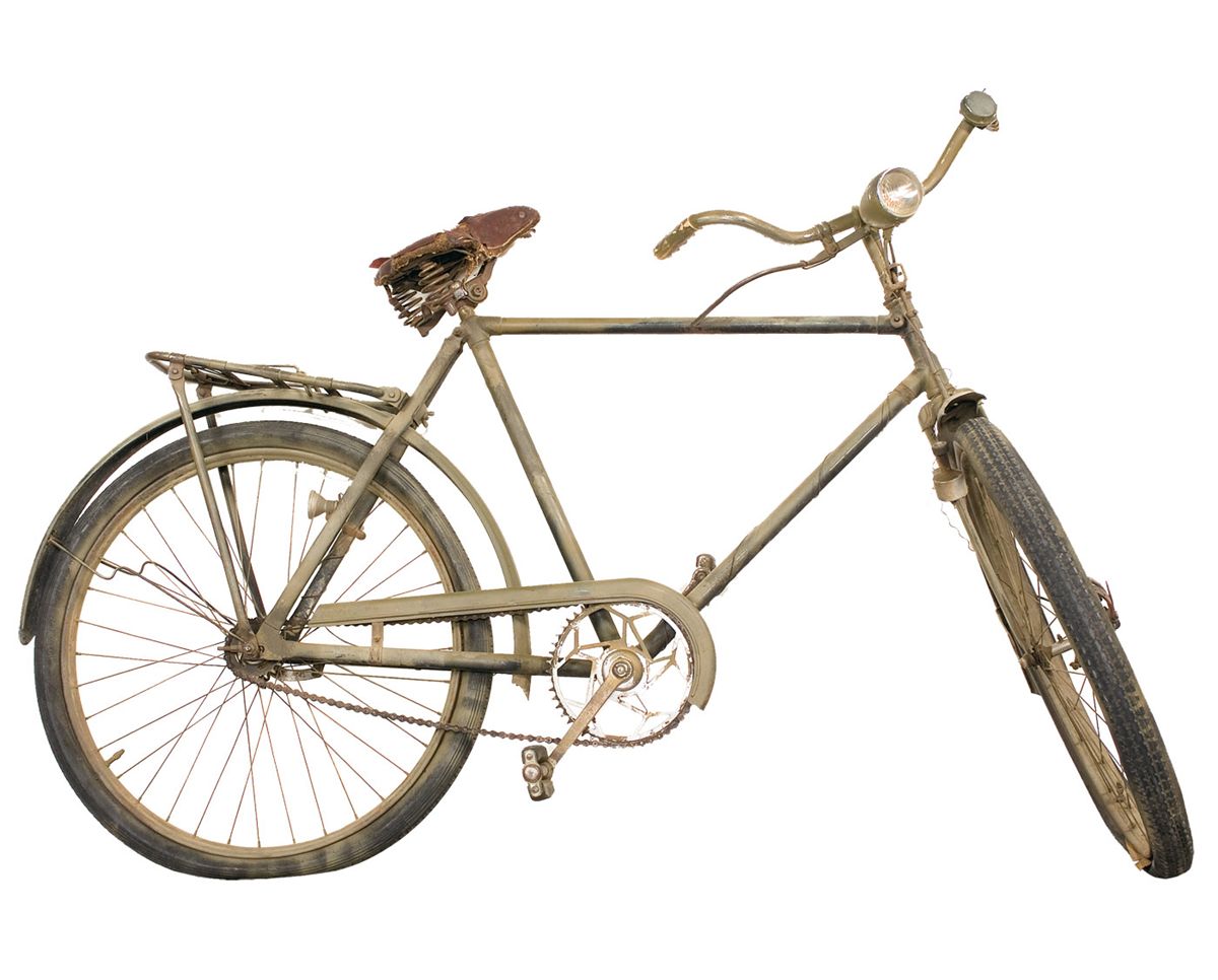 Founded in 1896, Torpedo Werke was put temporarily out of business in 1944, when the Allies bombed the factory. Finished in a matte green, with a headlight bar with front wheel generator, carved and painted grips, a small bell on the left bar, rod-style front brake, leather covered seat, pedal mounted reflectors and a cargo rack behind the seat. Also included with the bike is a seat for a BSA bicycle and a deactivated Panzerfaust rocket with launch tube.