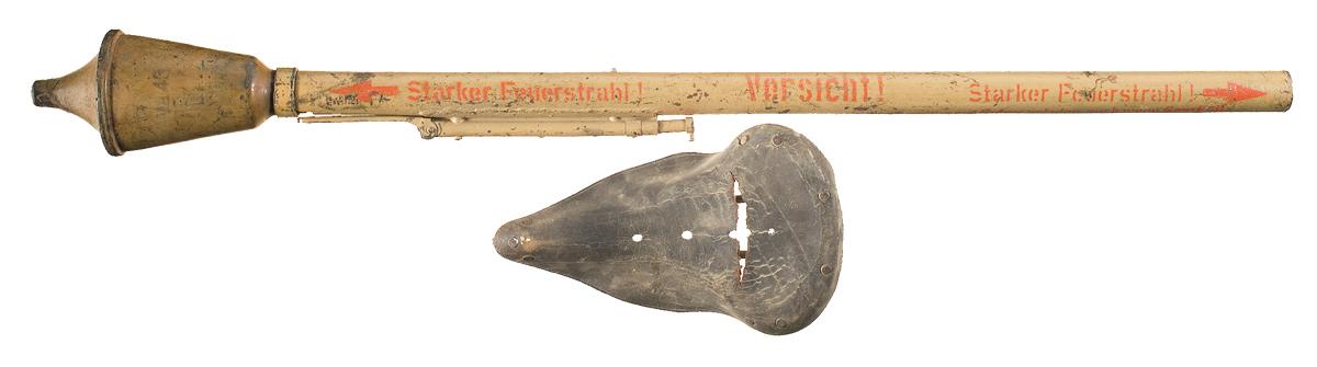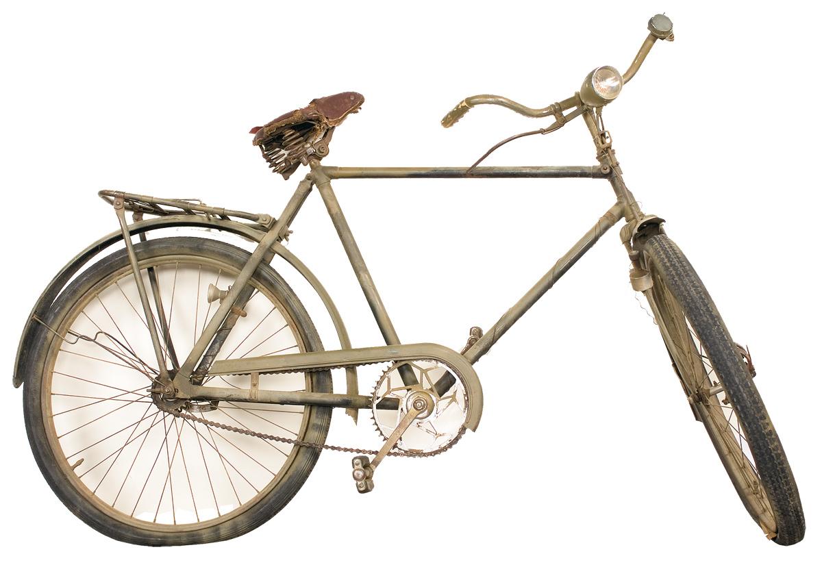 Founded in 1896, Torpedo Werke was put temporarily out of business in 1944, when the Allies bombed the factory. Finished in a matte green, with a headlight bar with front wheel generator, carved and painted grips, a small bell on the left bar, rod-style front brake, leather covered seat, pedal mounted reflectors and a cargo rack behind the seat. Also included with the bike is a seat for a BSA bicycle and a deactivated Panzerfaust rocket with launch tube.