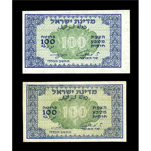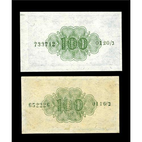 <B>Israel</B></I> 100 Pruta (1952) Pick 12c Choice CU</B></I><BR><B>Israel</B></I> 100 Pruta (1952) Pick 12d CU.</B></I><BR>The 12c note has the correct alignment for the Neeman signature, while the 12d is the rare Neeman signature invert. The invert is listed at $3000 in Unc in the Krause reference. The 12d also has toned a shade. <BR><BR><B>Important notice: