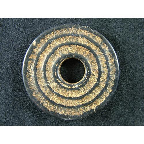 A fine neolithic Hongshan Culture jade bi (ring), ca. 3600B.C.-3000B.C.. Dimensions are 2-5/8" diameter, 3/8" thick. The bi was carved from a piece of black jade. The shape is a flatten round disk with a hole bore through the center. There are a series of carved recessed rings on both sides. The bi exhibits a beautiful golden/amber colored calification, formed primarily within these recessed rings. The color constrast of the golden flecks against the deep black of the bi is absolutely stunning. The Chinese call this calcification baojing and it is a verifiable diagnostic of great age. The jade bi weighs 62 grams. This would make a fantastic pendant too by simply attaching a black beaded/unbeaded cord.