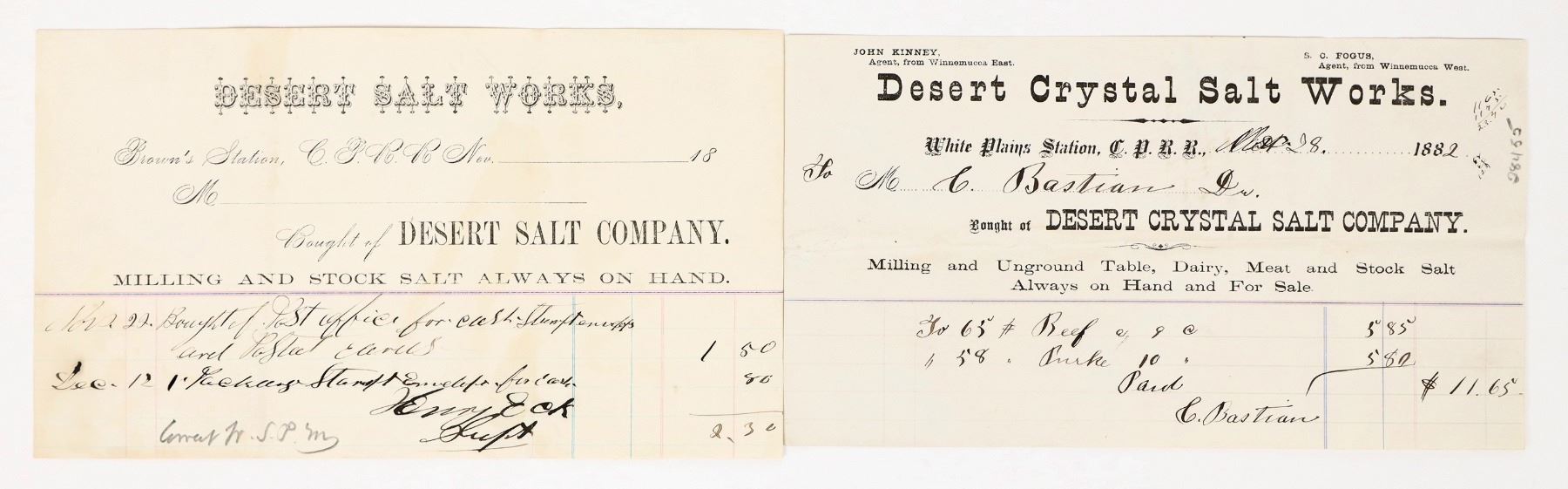 Two different very scarce billheads for companies mining desert salt in Nevada for use in mining. 1) Desert Crystal Salt Works. Dateline White Plains Station, CPRR, 1882. White Plains is a ghost town in Churchill County that was founded in the 1870s due to salt deposits. 2) Desert Salt Works. Dateline Brown's Station, CPRR Nev. (Reverse dated 1882). Brown's Station was located 40 miles from Wadsworth on the edge of Humboldt Lake.