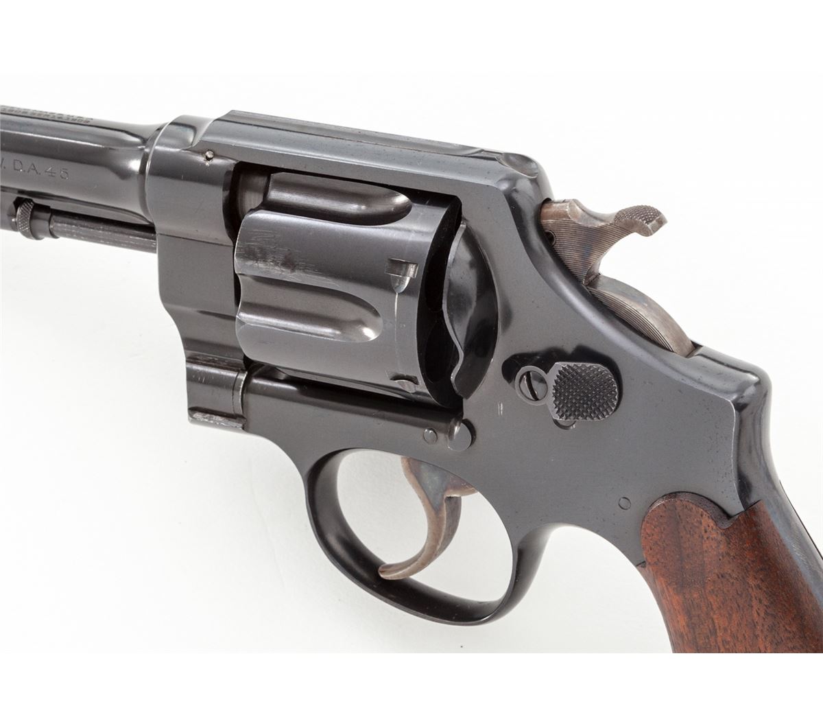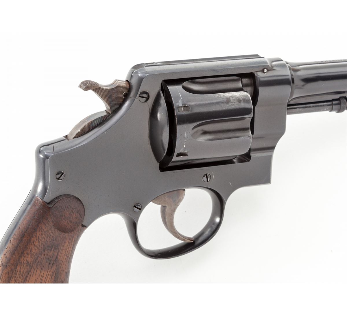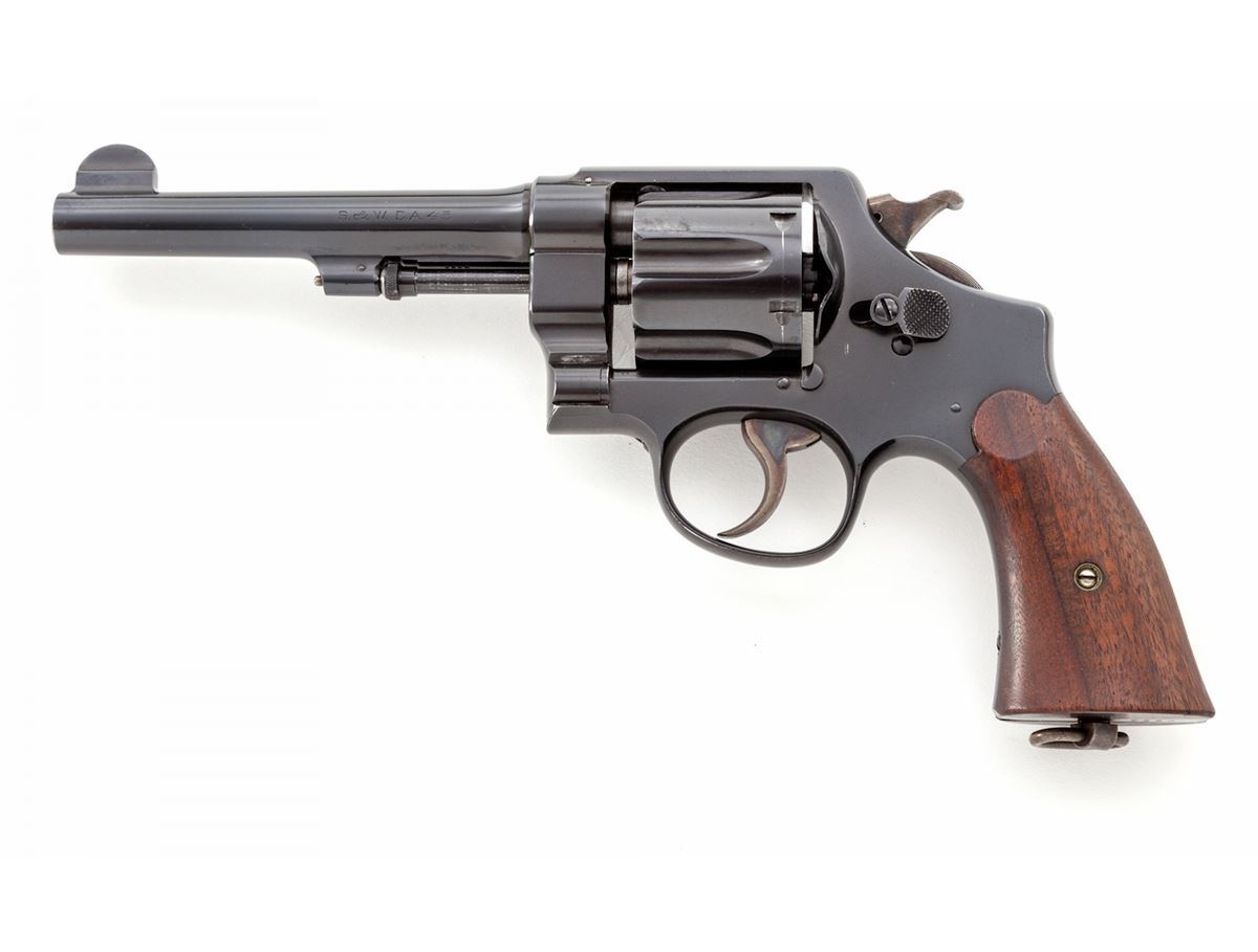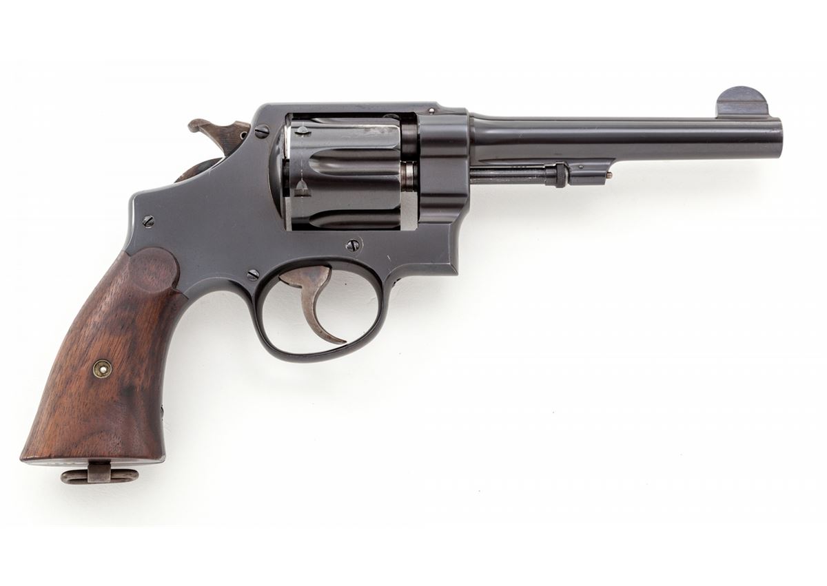 Rare O-Series Smith & Wesson Pre-1917 Double Action Revolver, #0284, .45 ACP/Auto rim cal., 5-1/2'' barrel, blue finish, smooth factory walnut grips with lanyard loop in butt. Early commercial version of their 2nd Model swing-out revolver. Factory letter confirms all features, as shipped to Donald Birnie, Jan. 3, 1918. The Birnie's were a prominent Springfield, Mass. Family, and there is an avenue in Springfield named for them. The large iron frence surrounding the Springfield Armory was built by the Birnie family. Donald Birnie, the revolver's original owner, was a physician in Springfield when WWII broke out. Birnie family members do not recall the revolver ever being fired. The revolver remained in the Birnie family until 2002 when a grandson sold it off. These O-Series group of handguns is comprised of numerous models, and the serial number range recorded is from 01 to 0548. Condition is excellent showing light and minor scratching, and very slight holster wear at muzzle, as well as near two flutes of the cylinder. Factory S&W grips are near perfect. Action is crisp, bore is excellent. Est.: $3,500-$5,000. (C&R/PPT) c KIRT FIND LETTER