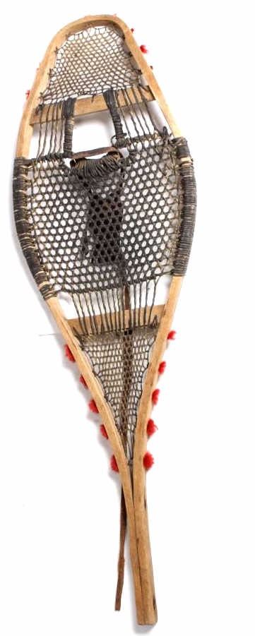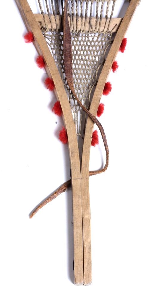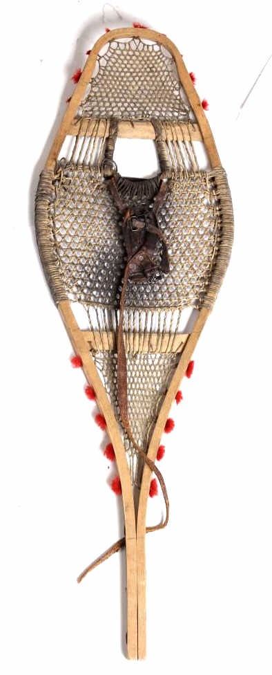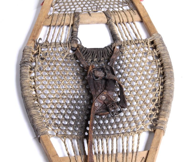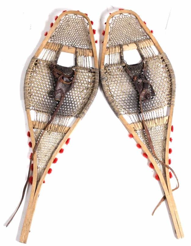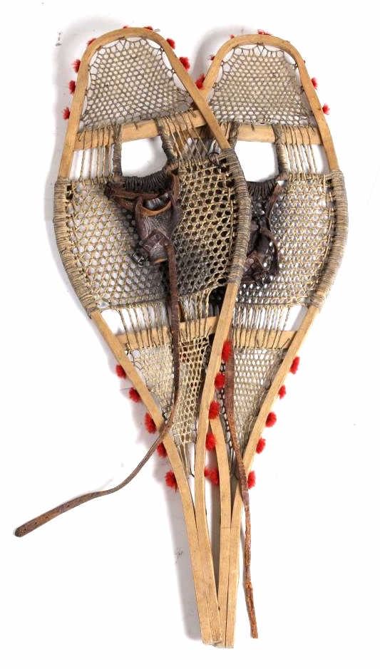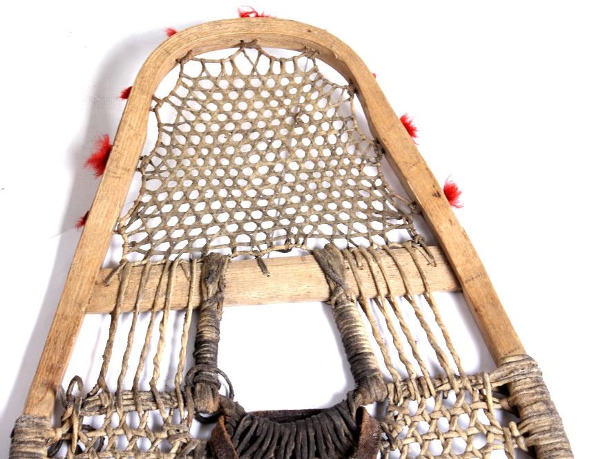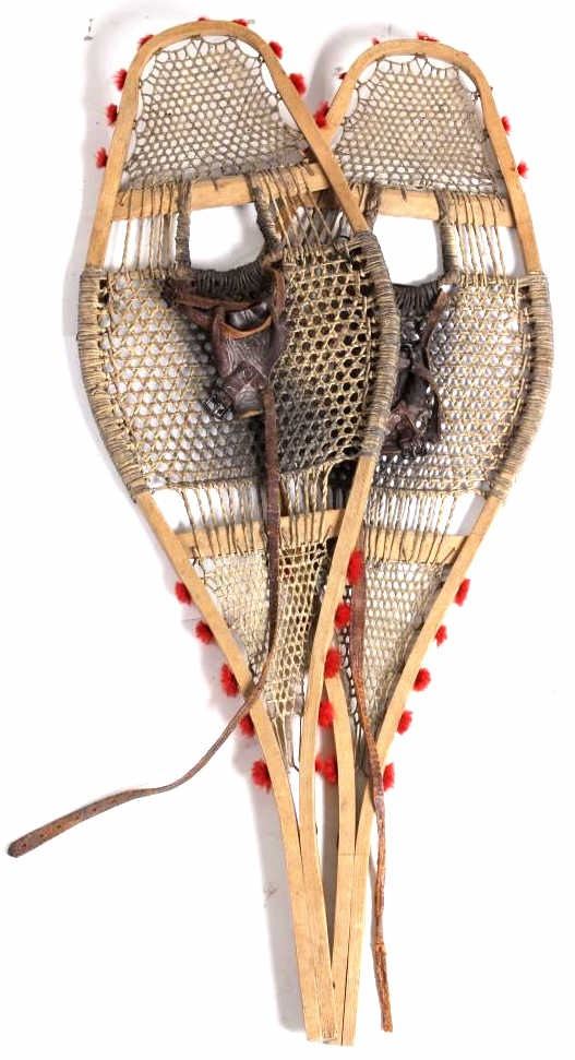 Offered in this lot we have a rare Ojibwa Native American rawhide snowshoes originating from the early 1900's. The snowshoes feature a woven lattice work of rawhide on a wooden frame with leather shoe straps. The pieces show puffs of red fabric along the sides where the rawhide crossed through the wood. The shoes where hand made by the Ojibwa Native American tribe located near Lake Superior. The snowshoes show good condition overall with some wear due to use and age. The shoes measures 35" long by 11 1/4" wide.