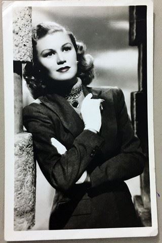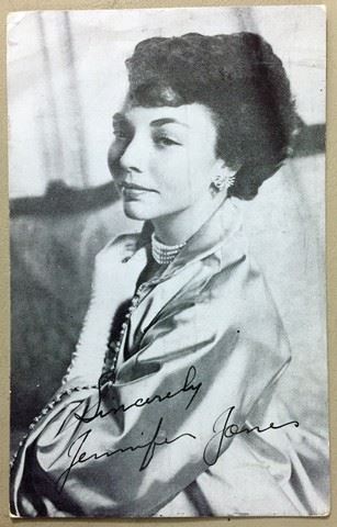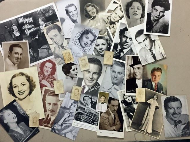 Many of the biggest contract film stars are included in this collection (~40) ca. 1930-1940. These are rare black and white, color and sepia-tone vintage postcards, arcade cards, cigarette cards and photos and include stars such as: Richard Arlen, Lauren Bacall (autographed), Joan Bennett, Humphrey Bogart (autographed), Scott Brady (autographed), Jack Buchanan, Dorothy Burgess, George Burns with Gracie Allen (an autographed photo collage, Peggie Castle, Joan Caulfield (autographed), Dane Clark, Jackie Cooper, James Craig, Robert Cummings, Olivia De Havilland, sixties sensation Lonnie Donegan, Vera Ellen, Rhonda Fleming, John Freland, Janet Gaynor, Clark Gable (2), Jon Hall, John Lund (autographed), Isabel Jeans, Jennifer Jones, Evelyn Knight, Dean Martin, one of the founders of the Academy of Motion Picture Arts & Sciences is Conrad Nagel, Robert Montgomery, Ramon Novarro, George O’Brien, Maureen O'Sullivan from "Pride and Prejudice", Debra Paget, Cyril Ring, composer-conductor David Rose, John Russell, Norma Shearer. Verso on some of the postcards are pen pencil markings, copyright information and company stamps and the names of the recipients. The postcards are in good condition. The cigarette cards are damaged but the image of the star shines through. Verso most are blank or may have ink markings others have damaged due to age, glue, and liquid. Lonnie Donegan’s card is an exclusive series presented by New Record Mirror with his bio, it is number 7 (approx. 1 ½ x 2 to 3.5 x 5 in).Twosomes Gary Cooper and Jean Arthur from the Oscar winning film "Mr. Deeds" in French. Some images include photographic reproduction of the original autograph.