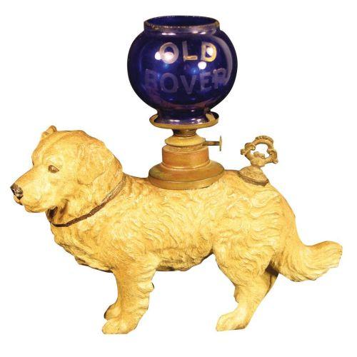 Old Rover cigar lighter. Original etched glass globe. Wonderful full figured dog. Very good original condition. 10 X 9 1/2 X 3 inches.