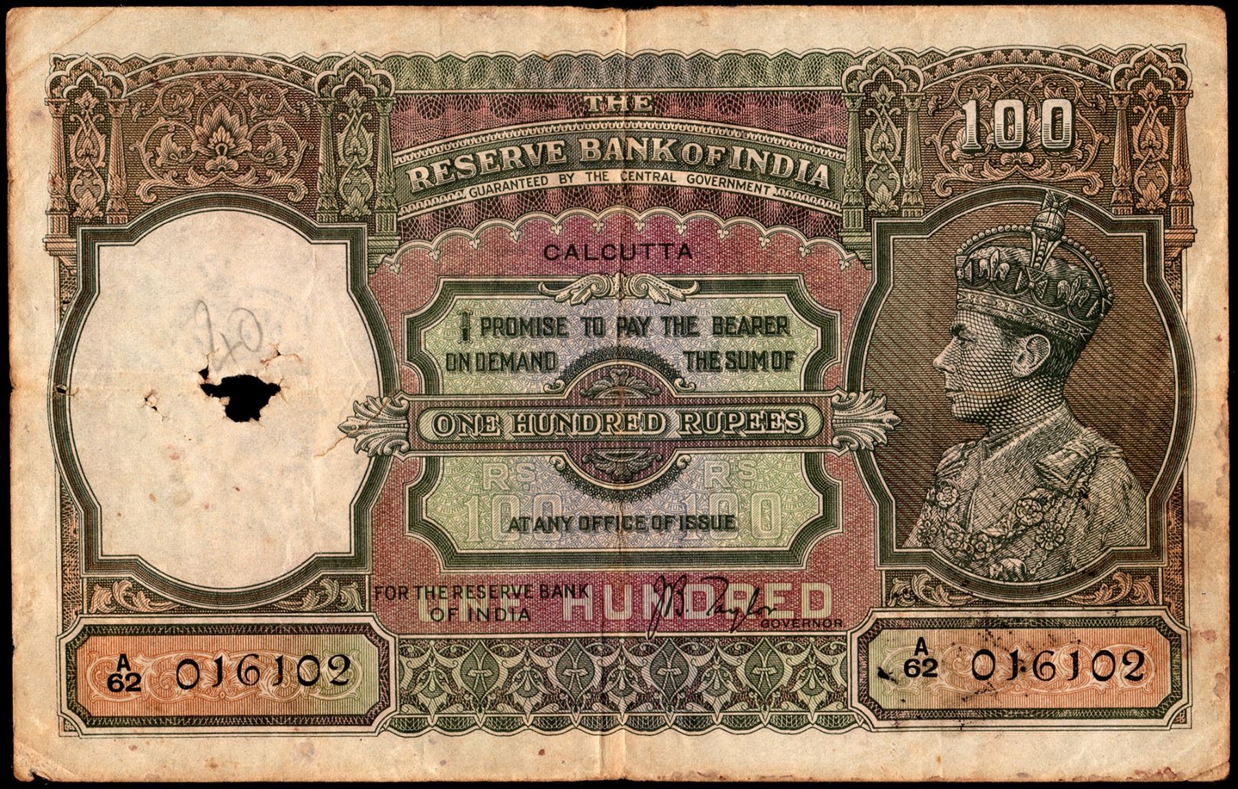 British India, 1938, King George VI, 100 Rupees, Calcutta Circle, Signed by J.B. Taylor, Serial number in Black, A Prefix, S. No. A62 016102, (KJ & RR # 4.7.1.B), holes, folds, stains, tears, graffiti, ink stamp at the back, about very fine, Rare.