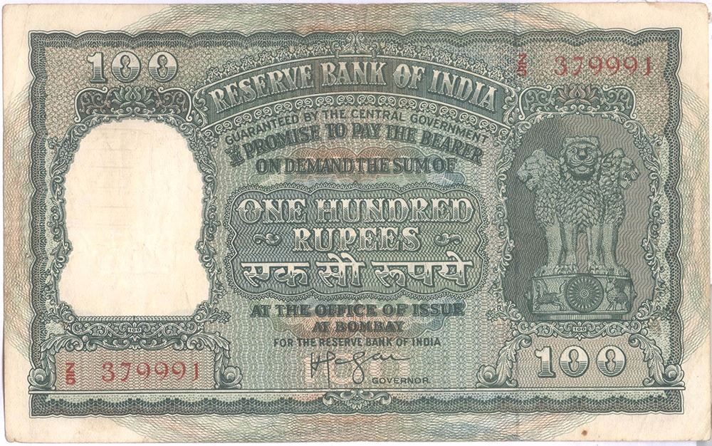 1959,100 Rupees, Persian Gulf Issue, H.V.R. Iengar, S.No. Z5 379991,(KJ RR 6.12.4.1), extremely fine - almost Unc, Extremely Rare.