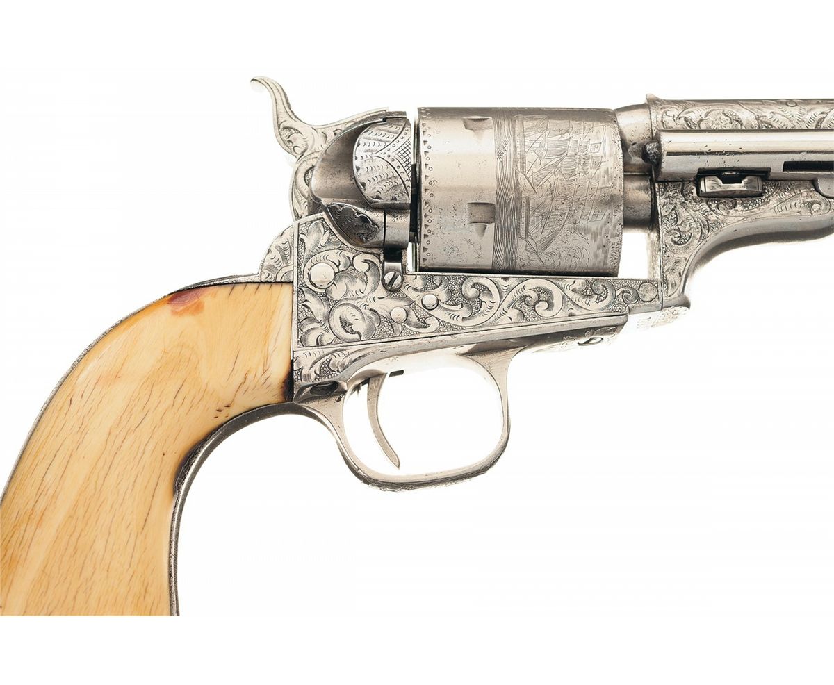 Very fine. The revolver has been professionally restored and presents an outstanding appearance. There is scattered flash pitting on the rear portions of the barrel lug and the front edges of the cylinder. The left side of the barrel has some scattered minor pitting. The grip is very good overall and has shrunk slightly showing some deterioration along the front strap, yellowing with some brown areas and age cracks on the bottom. The engraving remains deep and crisp. The cylinder retains 95% or more of the naval battle scene. The markings are clear. The action is fine.