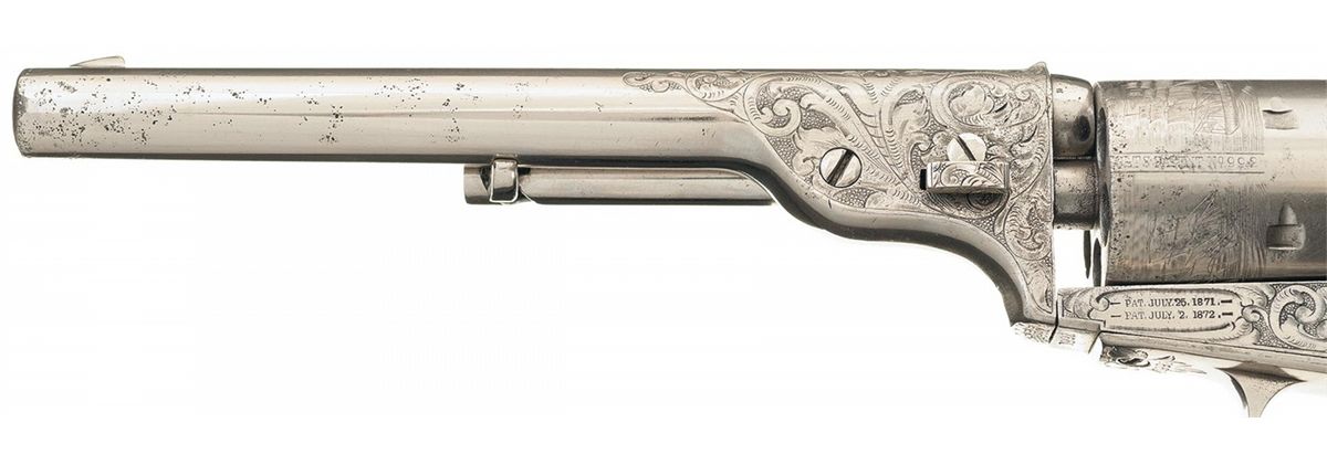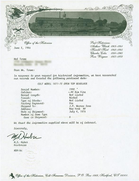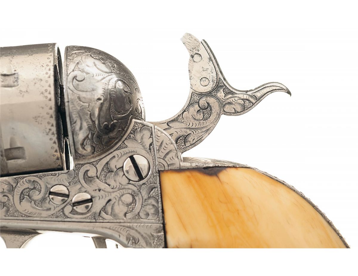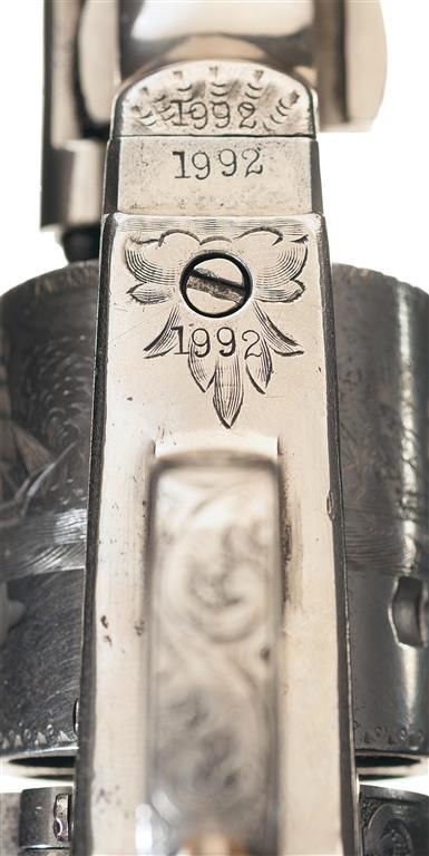 The accompanying Colt factory letter(photocopy) states that this revolver was one of eight factory engraved revolvers shipped to J.P. Moores & Sons on July 4, 1876. These eight revolvers are the only Model 1871-72 Open Top revolvers that were factory engraved. The letter lists the finish as "nickel", grips as "Not Listed" and verifies the factory engraving. The barrel, frame, trigger guard and back strap are decorated with factory scroll engraving on a punch-dot background. The barrel address is in a scallop bordered panel and the patent dates are surrounded by scroll engraving. The engraving on the bottom of the barrel lug and trigger guard incorporate the serial number. Colt Model 1871-72 Open Top revolver serial number 1970 was in the same lot of eight revolvers shipped to J.P. Moores on July 4, 1876 and is illustrated on page 158 of "The Book of Colt Engraving" by R.L. Wilson. Wilson describes the engraving on serial number 1970 as, "a flowery scroll design which may have been done by one of the younger craftsmen. But nevertheless one of the rarest deigns in the study of Colt firearms engraving". The engraving on this revolver is nearly identical to that on serial number 1970 and appears to have been executed by the same craftsman. The top of the barrel is marked with the one-line address "-ADDRESS COL. SAML COLT NEW-YORK U.S. AMERICA-" and "-PAT. JULY.25. 1871.-/-PAT. JULY 2.1872-" is roll-stamped on the left side of the frame. The cylinder is roll-engraved with the Texas Navy battle scene and "COLTS PATENT NO. 992". The inside of the loading gate is stamped with the assembly number "964". The full serial number "1992" is located on the bottom of the barrel lug, frame, trigger guard and back strap. The cylinder is stamped with the partial serial number "992". All nickel finish and fitted with a smooth one-piece ivory grip. Research by Colt experts indicates that the eight factory engraved, nickel plated Colt Model 1871-1872 Open Top revolvers shipped to J.P. Moores on July 4, 1876, were intended for display at the Independence Day celebration and Centennial display in New York City. The revolvers were serial numbers: 1932, 1970, 1982, 1983, 1992, 1993, 2003 and 2004. This revolver and serial number 1970 were both located on the Texas/Mexican border. Serial number 2003 is also offered in this auction.