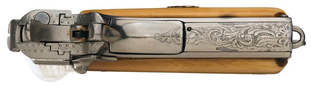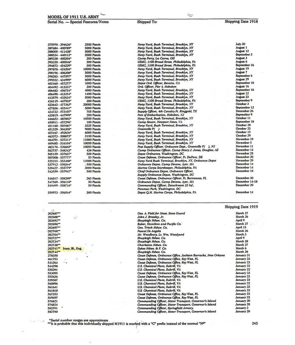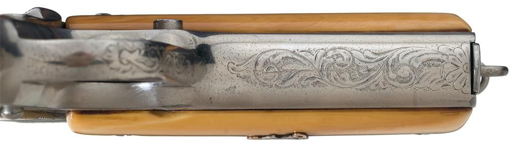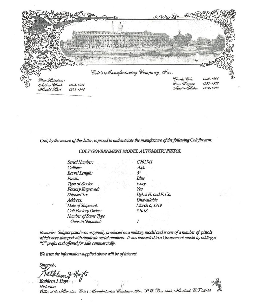 This is an attractive example of an extremely rare and probably one of a kind, original Colt Government Military Model 1911 that was produced with a duplicate military serial number that was Colt factory converted into a "Government Model" by stamping the "C" prefix in the serial number and then fully factory engraving the pistol. This super rare Colt is accompanied and verified by a Colt factory letter that is was an actual duplicate serial number that was factory engraved and shipped to Dykes H. and F. Co in March 1919. The factory letter states that it was shipped with the ivory grips, was factory engraved and was blued at the time of shipment, (however it currently has a "nickel plated" finish).The engraving pattern is a nice blend of larger scroll and vine engraving with a punch dot back ground with geometric borders around the various markings on the slide and frame. The slide has the two-line, two-block Colt patent and address markings that ends in 1913, with the Colt Rampant Horse logo in between the two blocks. The right side is marked with: "COLT/AUTOMATIC CALIBRE .45". The frame is correctly marked on the right side "GOVERNMENT MODEL" over the "C" prefix serial number "202741", both of which are noted in the Colt factory letter. The top of the frame has the single letter "S" Colt inspector's commercial proof, along with the Colt "VP" (Verified Proof) inside the small triangle on the left side of the trigger guard bow. The barrel is a correct pre-war commercial model that is marked with only a single "P" proof on the underside in front of the lug. The pistol has features such as the early style checkered slide stop, type two checkered thumb safety and flat smooth mainspring housing, short grip safety, and wide Colt hammer with the checkered spur. It is fitted with a set of smooth ivory grips with a large intertwined initials: "RB" inset into the right grip. The initials appear to be those as produced by a jeweler as the "R" is made from a gold material while the "B" is made form silver. This rare pistol includes an original WWI production military magazine with the double pinned base with the lanyard loop on the underside of the base.