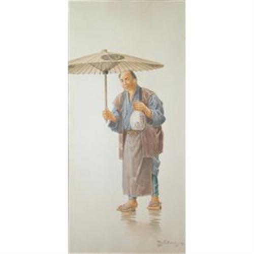 A fine original painting by Takuji Nakamura, depicting a male figure caring an umbrella and a sake bottle. We date this work to ca.1925. Dimensions are for the painting approximately 13" tall by 6.5" wide, (with frame 17" tall by 11" wide). Nakamura Takuji, (written with surname first), was born in 1897. He was a western-style painter. Born in Fukuoka-ken and worked in Kamakura. He graduated from the prestigious Tokyo University. He was an exhibitor at the Nikakai and the Tokyo Biennial. He is a member of the Issuikai and the Nitten. In 1953, he received the Education Minister's Prize for Fostering the Arts. His figurative paintings are done in a strong and simplified manner. This painting done in natural Japanese watercolors, depicts a man holding an unbrella and a sake bottle. The painting is signed in the lower right corner as T. Nakamura. The painting was made on what appears to be medium weight mulberry paper and is framed in a handmade wood frame that is consistent with our dating of the painting. There are 5 known Nakamura Takuji paintings exhibited in the National Museum in Tokyo, Japan. Condition consensus is extra fine condition and without injury or repair. The paper has a mild cream-beige tone.