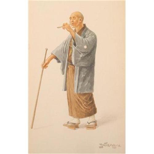 A fine original painting by Takuji Nakamura, depicting a standing male figure with a cane and smoking a pipe. We date this work to ca.1925. Dimensions are for the painting approximately 13" tall by 6.5" wide, (with frame 17" tall by 11" wide). Nakamura Takuji, (written with surname first), was born in 1897. He was a western-style painter. Born in Fukuoka-ken and worked in Kamakura. He graduated from the prestigious Tokyo University. He was an exhibitor at the Nikakai and the Tokyo Biennial. He is a member of the Issuikai and the Nitten. In 1953, he received the Education Minister's Prize for Fostering the Arts. His figurative paintings are done in a strong and simplified manner. This painting done in natural Japanese watercolors, depicts a man with a cane and smoking a pipe. The painting is signed in the lower right corner as T. Nakamura. The painting was made on what appears to be medium weight mulberry paper and is framed in a handmade wood frame that is consistent with our dating of the painting. This painting is lightly laid on a mat board with a waterbased adhesive. There are 5 known Nakamura Takuji paintings exhibited in the National Museum in Tokyo, Japan. Condition consensus is extra fine condition and without injury or repair. The paper has a mild cream-beige tone.