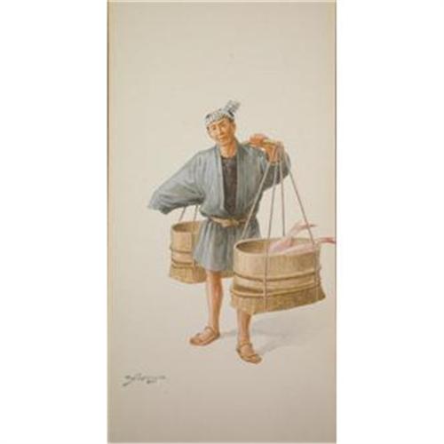 A fine original painting by Takuji Nakamura, depicting a male figure caring an umbrella and a sake bottle. We date this work to ca.1925. Dimensions are for the painting approximately 13" tall by 6.5" wide, (with frame 17" tall by 11" wide). Nakamura Takuji, (written with surname first), was born in 1897. He was a western-style painter. Born in Fukuoka-ken and worked in Kamakura. He graduated from the prestigious Tokyo University. He was an exhibitor at the Nikakai and the Tokyo Biennial. He is a member of the Issuikai and the Nitten. In 1953, he received the Education Minister's Prize for Fostering the Arts. His figurative paintings are done in a strong and simplified manner. This painting done in natural Japanese watercolors, depicts a man holding an unbrella and a sake bottle. The painting is signed in the lower right corner as T. Nakamura. The painting was made on what appears to be medium weight mulberry paper and is framed in a handmade wood frame that is consistent with our dating of the painting. There are 5 known Nakamura Takuji paintings exhibited in the National Museum in Tokyo, Japan. Condition consensus is extra fine condition and without injury or repair. The paper has a mild cream-beige tone.