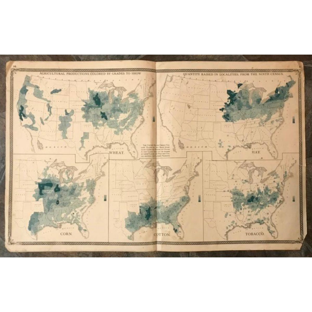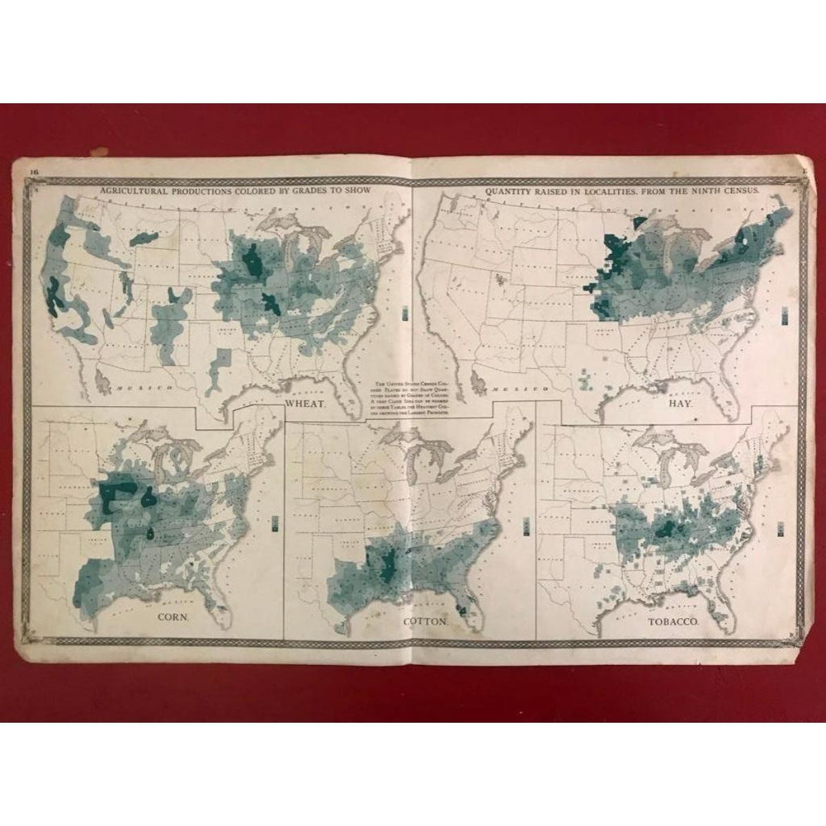Rare, original 1876 atlas map of the United States Agriculture Production - five agricultural maps (in inset form) of the production of wheat, hay, corn, cotton and tobacco. Each map distinguishes the distribution of crop production through contrasting hues of green - higher levels of production are indicated by darker hues, while lower levels of are indicated by lighter hues. An explanation for the census data is placed in the center of the map. Author: Baskin, Forster and Company Short Title: Agricultural productions colored by grades to show quantity raised in localities. Wheat, hay, corn, cotton, tobacco. Publisher: Baskin, Forster & Co. Publisher Location: Chicago ***On the reverse ( left side ) - United States Census, 1870 Vital Statistics, Deaths, divided into 4 sections - Deaths from Consumption, Malarial Diseases, Enteric Cerebro-Spinal & Typhus Fever, & Intestinal Diseases, ( right side ) Population, divided into 5 sections - Density of Population, Foreign Population, Colored Population, British American Population & Swedish & Norwegian Population. 17" X 27 1/2". ** Small loss to bottom right edge & light foxing due to age, per photo. Â