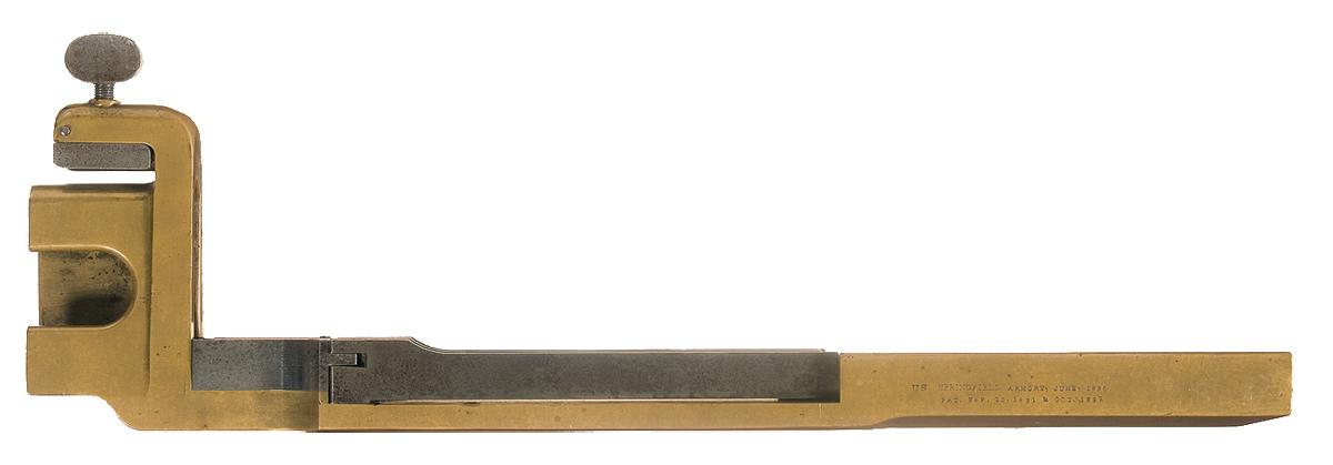 This is a rare original Bruce feed for a Colt Gatling gun. It consists of a brass frame that holds a swinging bar with a pair of machined slots that would accept the cartridges. The frame is marked "US SPRINGFIELD ARMORY, JUNE, 1886 / PAT. SEP. 20, 1881 &OCT. 3, 1883".
