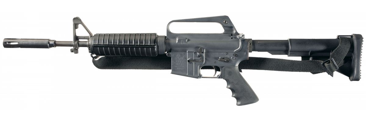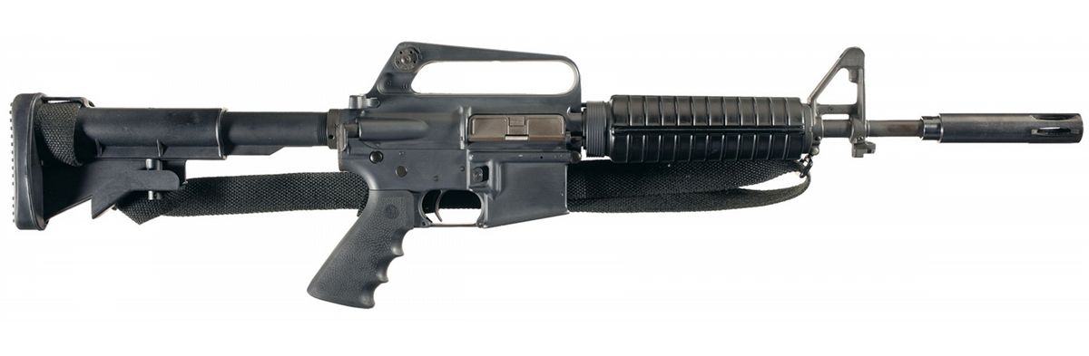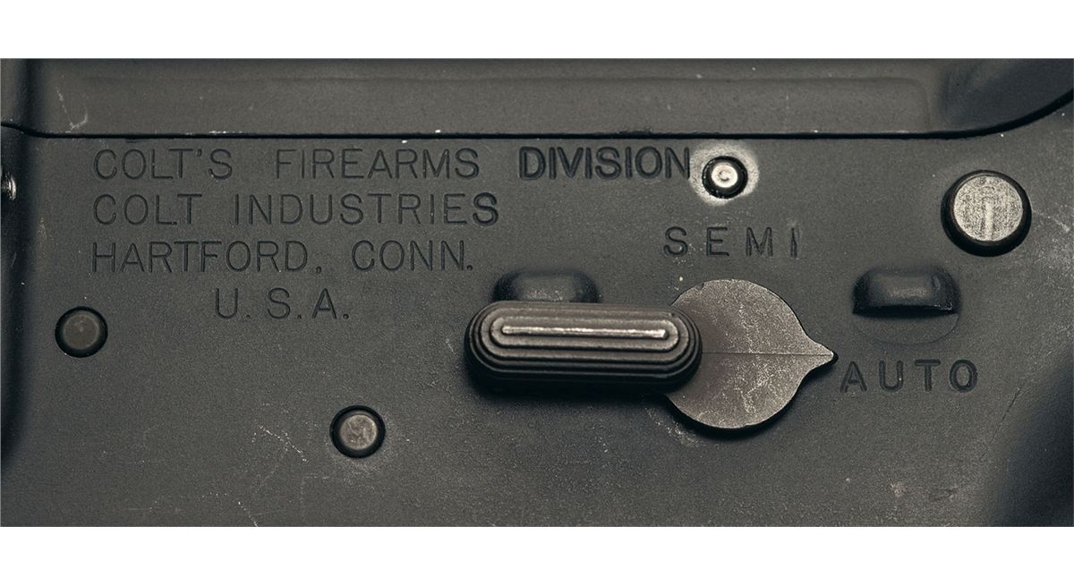 This is a beautiful example of a very rare, original Colt Firearms Division manufactured, fully automatic M16A1 carbine. These original Colt fully automatic M16 series of rifles and carbines are very rare to find on the open market today. These were actually produced on the same manufacturing line as their military counter part using the same military grade, factory original parts. To keep them separate and distinct from the Military weapons they were given their own special commercial serial number designation in the 9 Million serial number range. This model is currently configured to duplicate the earlier XM177E2 series of carbines, that were produced during the Vietnam era. It has a 16 inch chrome lined barrel with Colt type short hand guards with the aluminum heat shields inside, which has been fitted with a longer commercial XM177E2 type flash hider. It has an original Colt M16A1 series upper receiver with the forward assist on the right side with the two-position flip rear sight, an original M16A1 Colt marked bolt and bolt carrier group. Currently it is fitted with a later pattern polymer/plastic sliding buttstock on the original aluminum receiver extension tube and a rubber pistol grip. Both items can be converted back to their original configuration. It has an original Colt M16 type lower receiver with the raised fence around the magazine release button with the reinforced, lower rear section. The left side of the receiver is correctly marked with the Circled Colt Rampant over "COLT/M16A1/CAL. 5.56 MM/9271363" with the rear section marked "COLT FIREARMS DIVISION/COLT INDUSTRIES/HARTFORD CONN./U.S.A.", with "SAFE/SEMI/AUTO" marked around the selector switch. This excellent little carbine is complete with a black nylon sling, but no magazines.