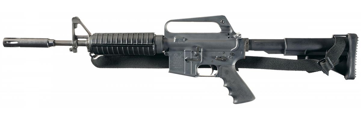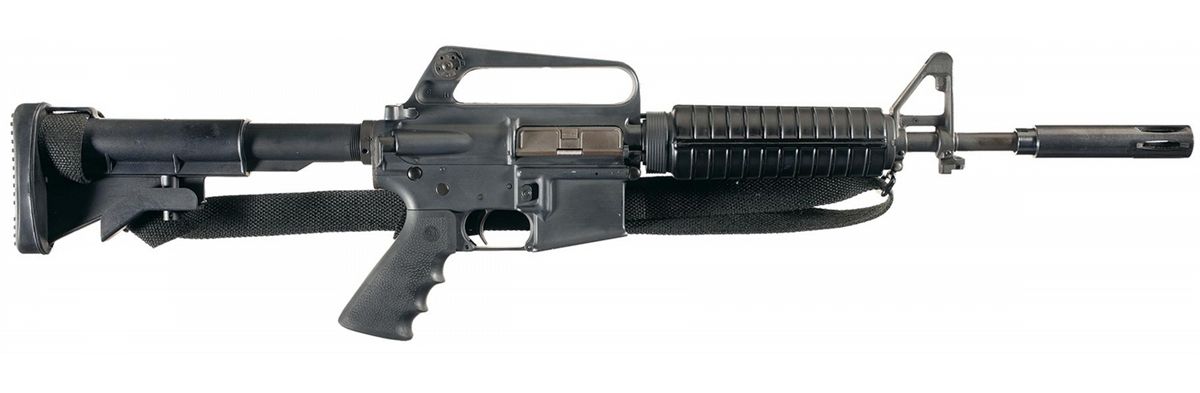 This is a beautiful example of a very rare, original Colt Firearms Division manufactured, fully automatic M16A1 carbine type. These original Colt fully automatic M16 series of rifles and carbines are very rare to find on the open market today. These were actually produced on the same manufacturing line as their military counterpart using the same military grade, factory original parts. To keep them separate and distinct from the Military weapons they were given their own special commercial serial number designation in the 9 Million serial number range. This model is currently configured to duplicate the earlier XM177E2 series of carbines, that were produced during the Vietnam era. It has a 16 inch chrome lined barrel with Colt type short hand guards with the aluminum heat shields inside, which has been fitted with a longer commercial XM177E2 type flash hider. It has an original Colt M16A1 series upper receiver with the forward assist on the right side with the two-position flip rear sight, an original M16A1 Colt marked bolt and bolt carrier group. Currently it is fitted with a later pattern polymer/plastic sliding buttstock on the original aluminum receiver extension tube and a rubber pistol grip. Both items can be converted back to their original configuration. It has an original Colt M16 type lower receiver with the raised fence around the magazine release button with the reinforced, lower rear section. The left side of the receiver is correctly marked with the Circled Rampant Colt over "COLT/M16A1/CAL. 5.56 MM/9271363" with the rear section marked "COLT FIREARMS DIVISION/COLT INDUSTRIES/HARTFORD CONN./U.S.A.", with "SAFE/SEMI/AUTO" marked around the selector switch. This excellent little carbine has a black nylon sling, but no magazines.