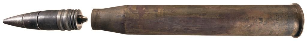 This is an exceptionally rare WWII German 88mm anti-aircraft or tank round. The 88mm gun was originally designed as a anti-aircraft/flak gun in 1936 and then subsequently was used as a highly mobile field artillery piece and anti-tank gun in the various early battles in Europe and even in use during the Africa Corp campaigns. In 1942/43 it was adopted as the main tank cannon for the Panther, Tiger I and Tiger II tanks that were seen in all the German tank battles. This round was so effective it devastated the battlefields in Russia and Europe by utterly destroying Allied tanks and field gun emplacements with single shots kills out to 2000 meters, as well as its use as an anti-aircraft weapon in defending the fatherland. Now you would not think that with millions and millions of these round manufactured during WWII you would see a lot of these around however that is not the case as 99.9% were demilitarized or just used by the other European countries after WWII. The brass case is 32 1/4 inches long and the base/headstamp is marked "bzs/4" next to "enz/6388st/88KwK43". The "enz" code was for the "Enzesfelder Metallwerk", Enzesfeld plant, Vienna, Austria. The 88mm steel shell weighs approximately "22 lbs" and is approximately 15 inches long. It is equipped with two driving bands on the lower section of the shell and the base of the round is marked "A/bye/375" and is stamped with two "Eagle/WaA34" Waffenamt proofs next to a small shield that is also stamped "bye/26". This wartime code was for the "HANOMAG-Hannover'sche Maschinenbau A.G. vorm." Georg Egestorff, Hannover. It is stored in a WWII wooden shipping crate that is stenciled on top of the lid with: (Kw. K. 43)/8.8cm (Pak 43 u. 43/1./2./3) /(Pak43/41) the lower left corner is also stenciled with: "Heers Ammunition/(an undistinguishable weight)". The box has two steel hasps/locks on the front with two steel hinges on the back.