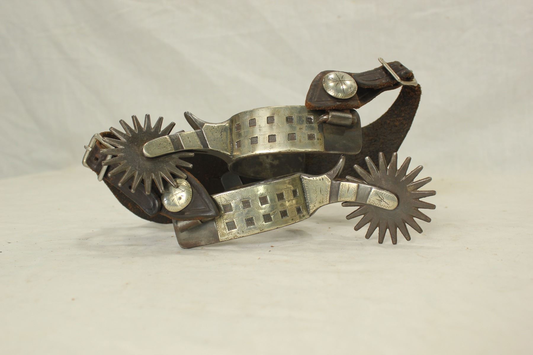 Highly sought after large Roy Quick pattern spurs, marked O. Crockett inside the heelbands. Single mounted with a dazzling silver pattern and large multi-point rowels.