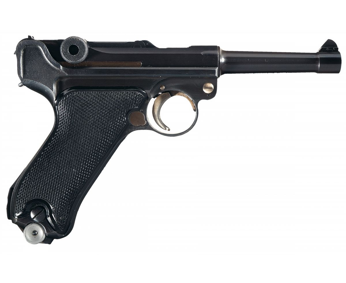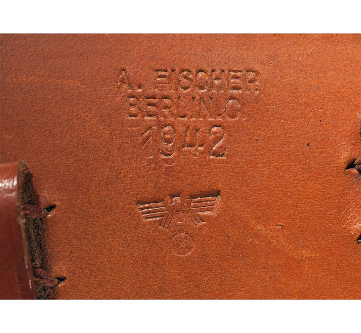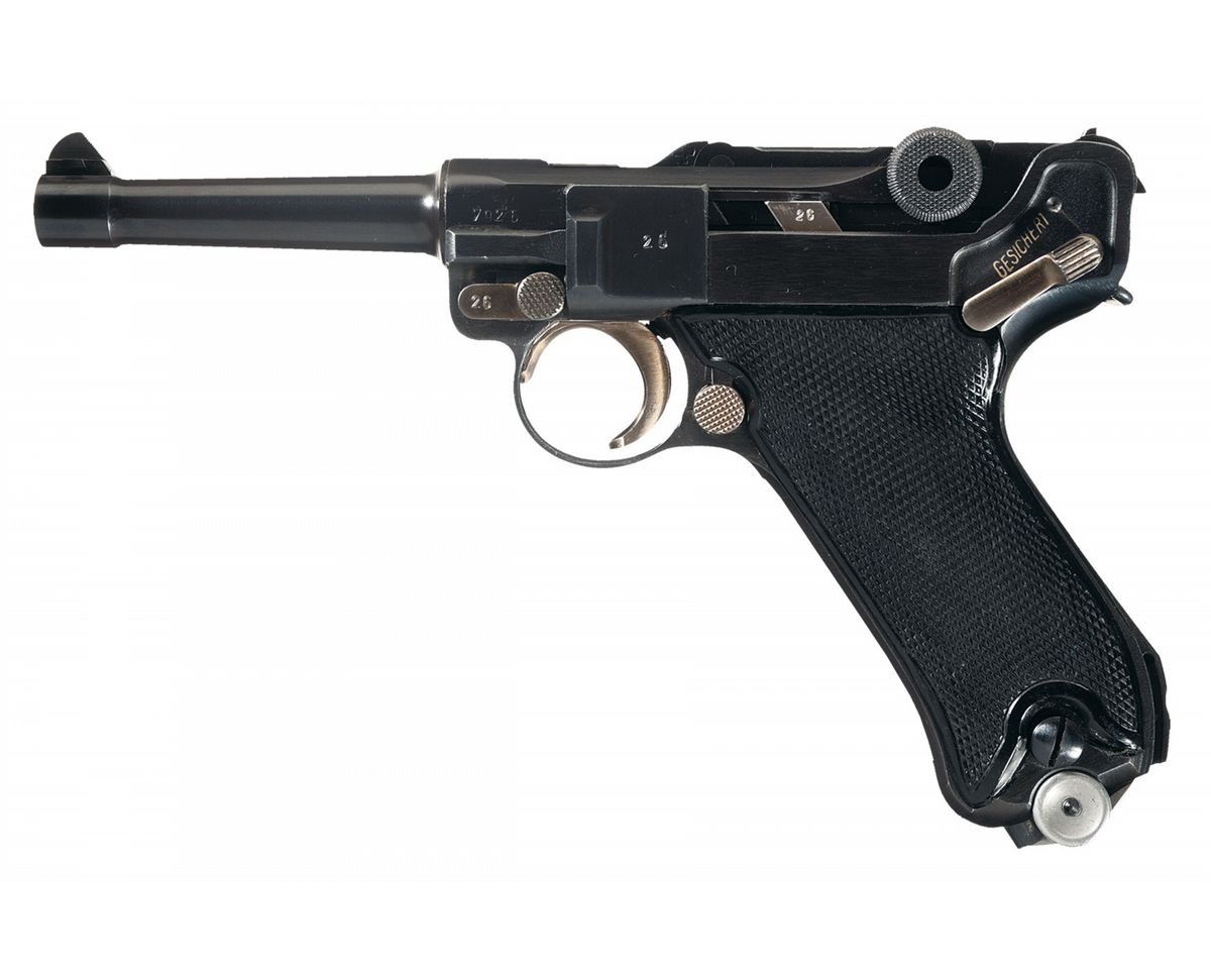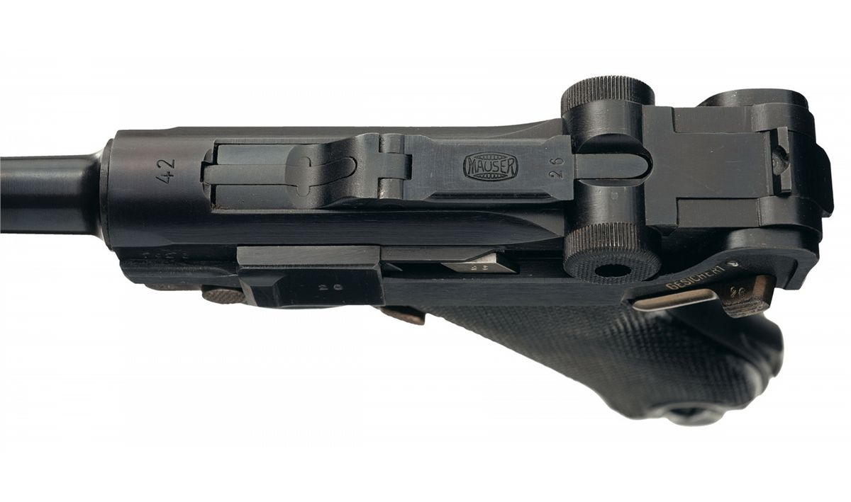 This is another exceptionally nice example of a very a scarce mid-WWII Commercial contract Mauser Banner Luger pistol chambered in 9 mm Luger. These Lugers were manufactured right up to the end of production just like the Commercial K98 rifles and generally fall into the range of those considered as a standard commercial Luger that were neither intended for sales outside Germany or Europe, or as a military or police contract. There were approximately 700 produced in this "w" serial number block. They exhibit nice workmanship with a high quality blue finish with the straw colored small parts. The top of the chamber is stamped "42" for 1942, the last year the Luger pistol was produced by the Mauser factory, with the Mauser Banner trademark stamped on the front toggle. The left side of the barrel extension, the underside of the barrel and the left side of the breechblock are all stamped with a single Nazi "Eagle/N" commercial proof acceptance mark with no other proofs on the pistol. The pistol is numbered in the military fashion with the full serial number (7926w) stamped on the front of the frame, and not on the barrel with serial number (7926) stamped left side of the barrel extension. The last two digits of the serial number (26) is stamped on various small parts. It is complete with two WWII all blue Type Three magazines with pinned aluminum bases, each stamped with "7926". It has a beautiful late production Police holster that is marked on the backside, "A. FISCHER/BERLIN.C/1942/Nazi Eagle Proof".