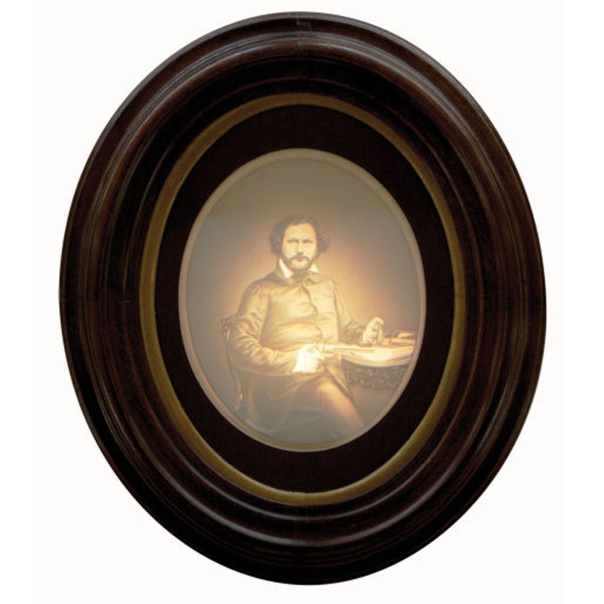 Rare Oval Framed Lithophane Portrait of Col. Samuel Colt Manufactured for Colonel Samuel Colt by KPM Royal Porcelain Works, Berlin, Prussia, Germany, in 1855. Composed of bisque porcelain, and when lit from the back has the appearance of a three-dimensional image of Colonel Colt. Documentation reveals that Colt ordered 111 of these from the Koenigliche Porzellan Manfaktur (KPM), in Berlin. The Colonel's intent was to have lithophanes in windows of his mansion, Armsmear. He may also have planned to present images of himself to friends and business associates.From the 111 examples, Colt received 101, which had been shipped on his behalf and to his attention, c/o J.P. Moore & Son, of New York. Of the remaining ten, one was kept by his agent in Berlin, C.F. Wappenhans. Eight were shipped to Colt's niece, Julia Leicester, and another was a gift to Dr. Stadthagen, Berlin. Five of the 101 delivered to Colt had imperfections.Rarely observed, the Colonel Samuel Colt lithophanes are based on the only images known to have been made of Colt in which he is holding a revolver (a Model 1851 Navy). The original photograph of that pose, taken by the professional photographer Graff, in Berlin, in c. 1854, was used by the workmen at KPM Royal Porcelain Works, for the lithophanes. A letter to Samuel Colt, from C.F. Wappenhans, dated October 21, 1855, provides details on this transaction. That letter appears among the Records of the Colt's Patent Fire Arms Mfg. Co., RG 103, Business File, Series III, Incoming Correspondence, Box 10, Connecticut State Library, Hartford. 5 3/4- x 7- x 1/8-inches, porcelain oval; within noticeably larger varnished hardwood frame, with gilt trim. Outside measurement of varnished wood frame: 12-inches- x 11-inches.Literature:R.L. Wilson, American Arms Collectors Percussion Colts and Their Rivals The Al Cali Collection, page 48, shows the mansion, Armsmear, approximately during the Civil War period, with lithophanes hanging in some of the windows.
