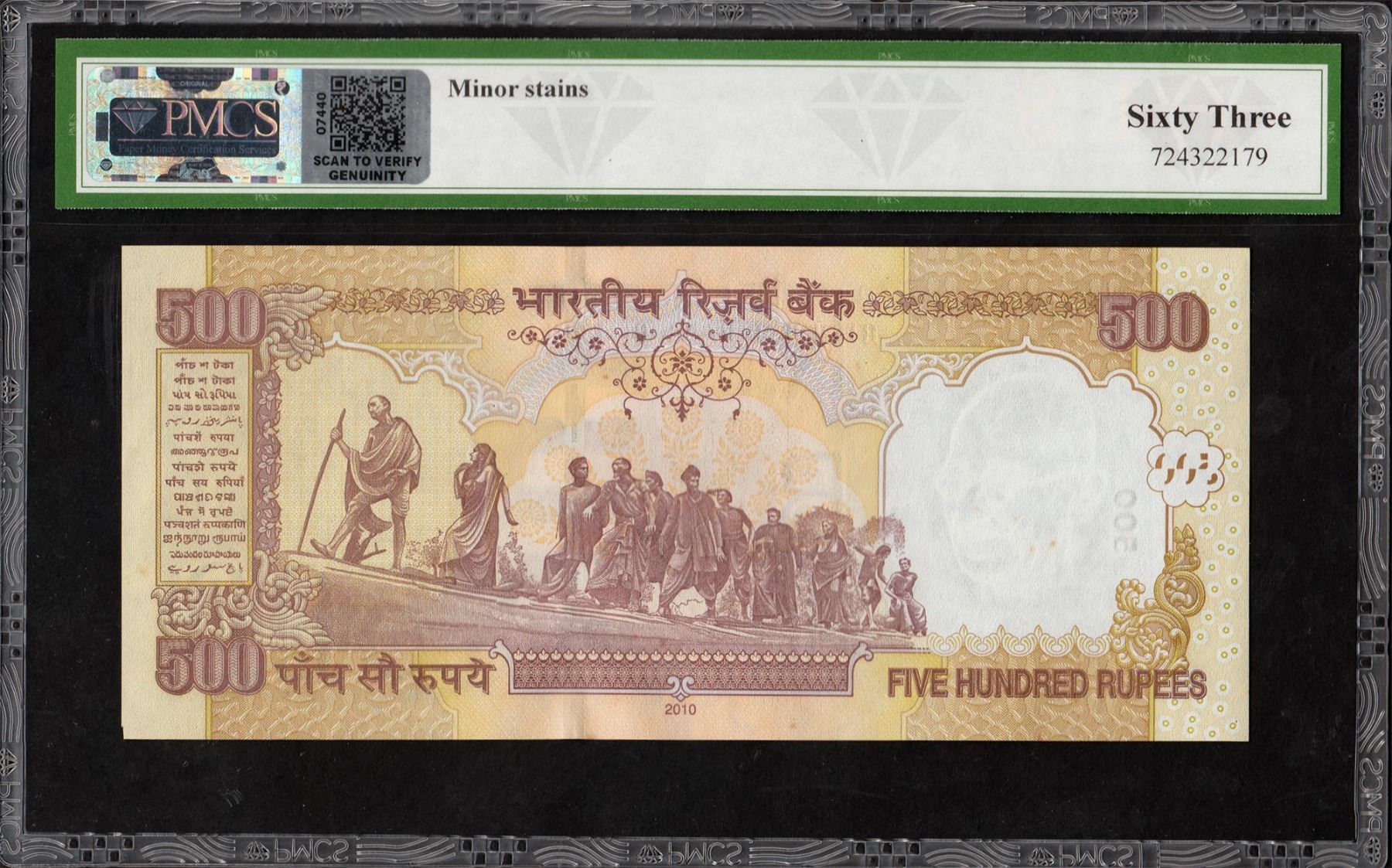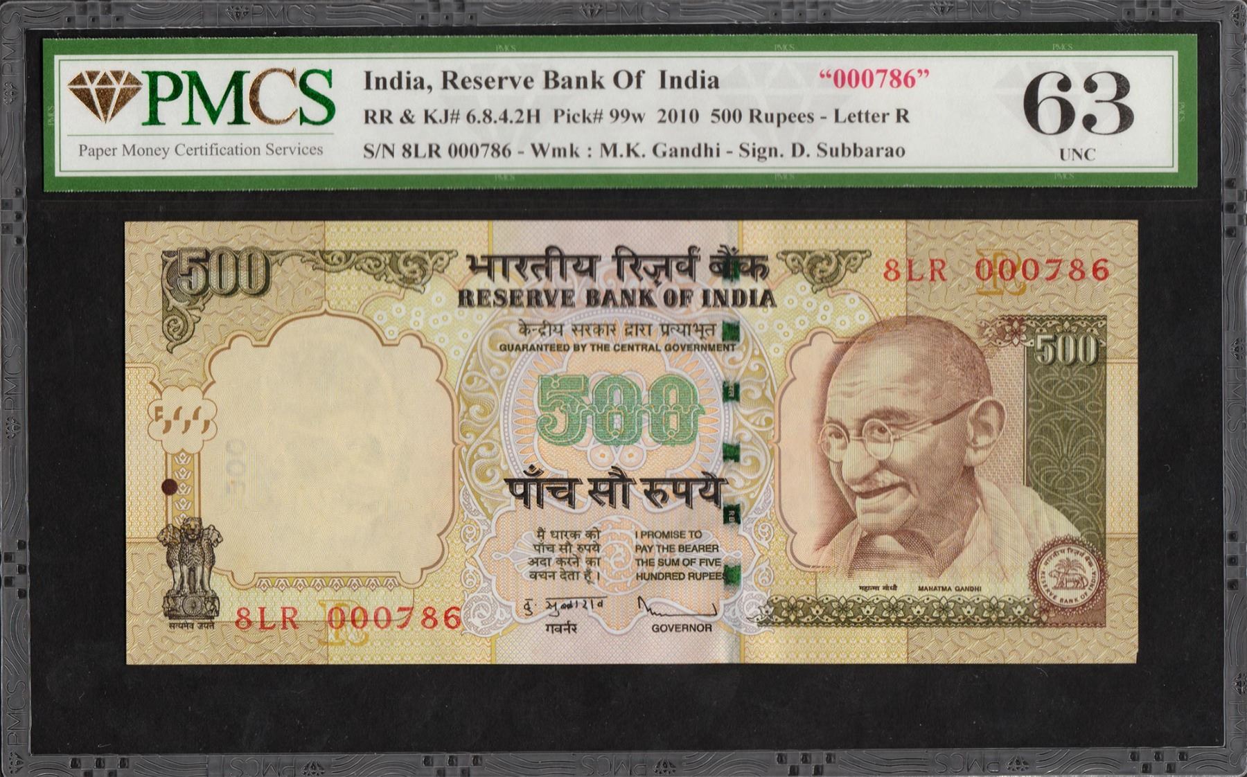 Republic India, 2010, 500 Rupees, 000786, Fancy Number, Signed by D. Subbarao, R Inset, LR Prefix, S. No. 8LR 000786, crisp paper quality, vibrant colours, no pinholes, minor stains, graded by PMCS as 63 UNC, Rare.