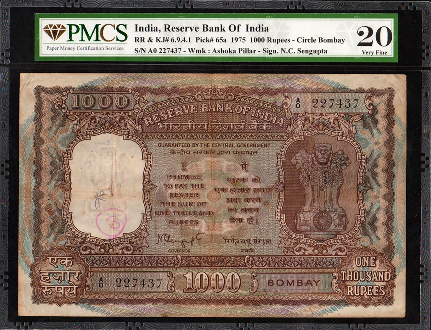 Republic India, 1975, 1000 Rupees, Bombay Circle, Signed by N.C. Sengupta, A Prefix, S. No A0 227437, a picture of Brihadeeswara temple at Tanjore on the reverse, (RM & AM # R 10.10), ink stamps, holes, folds, stains, graffiti, minor restored, graded by PMCS as 20 Very Fine, Rare.