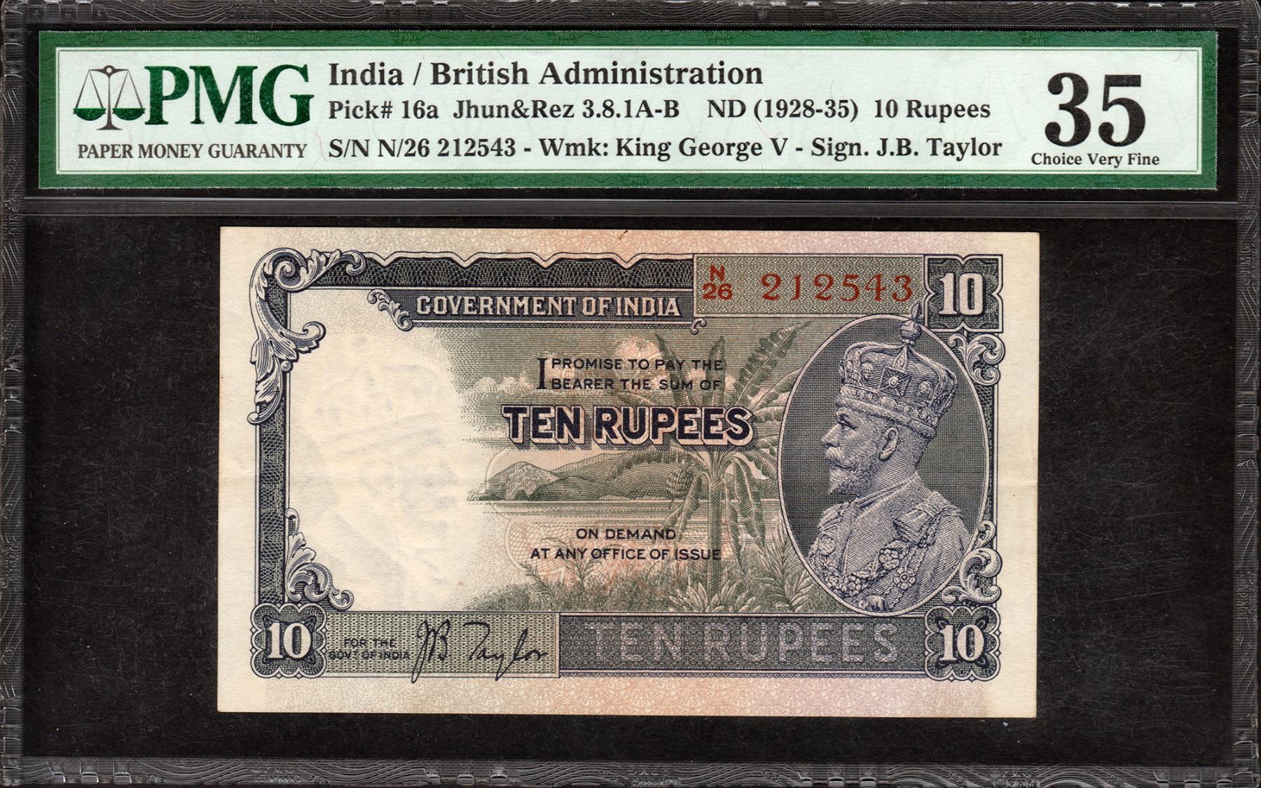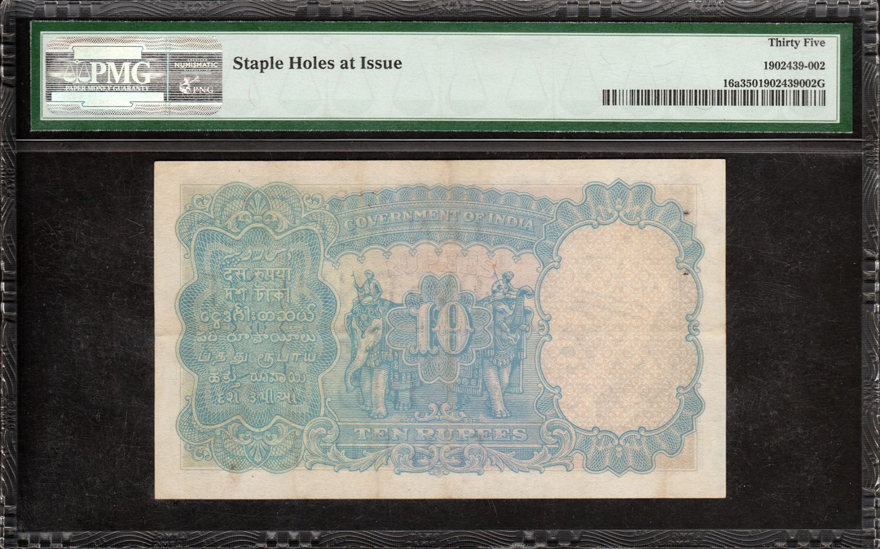British India, 1935, King George V, 10 Rupees, Signed by J.B. Taylor, N Prefix, S. No. N26 212543, (KJ & RR # 3.8.1B), staple holes at issue, stains, fold, graded by PMG as 35 Choice Very Fine, Rare.