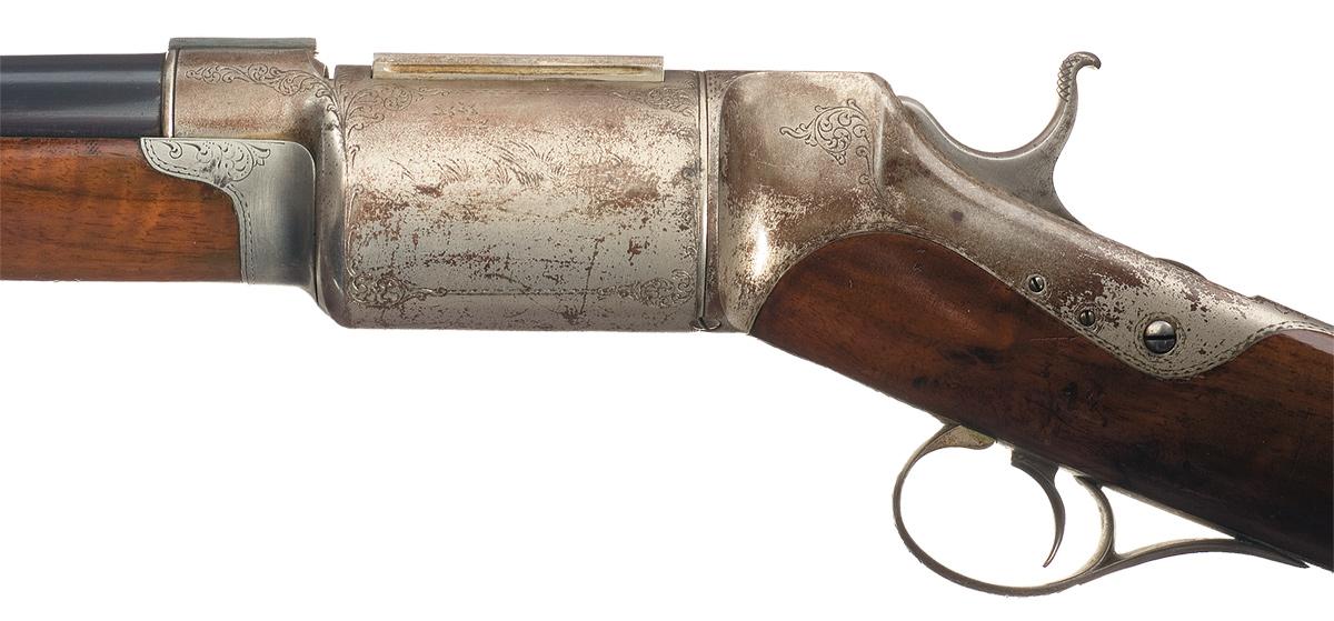 Nickel bead and groove sights, with a threaded muzzle, screw-on choke ring, and "ROPER REPEATING RIFLE CO / AMHERST. MASS. / PATENTED APRIL. 10. 1866." marked on top of the dust cover. The drum part of the receiver covers the four revolving spokes which place the patented steel shotgun shells in line with the barrel, and is decorated with a panel scene of a hunting dog lying patiently among weeds on the right side, and a hunter aiming at three ducks on the left. There is light scroll engraving at the front and rear of the action. Smooth deluxe walnut stock, with engraved pewter forearm fittings and an engraved nickel finished shotgun buttplate.