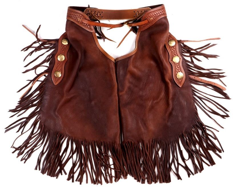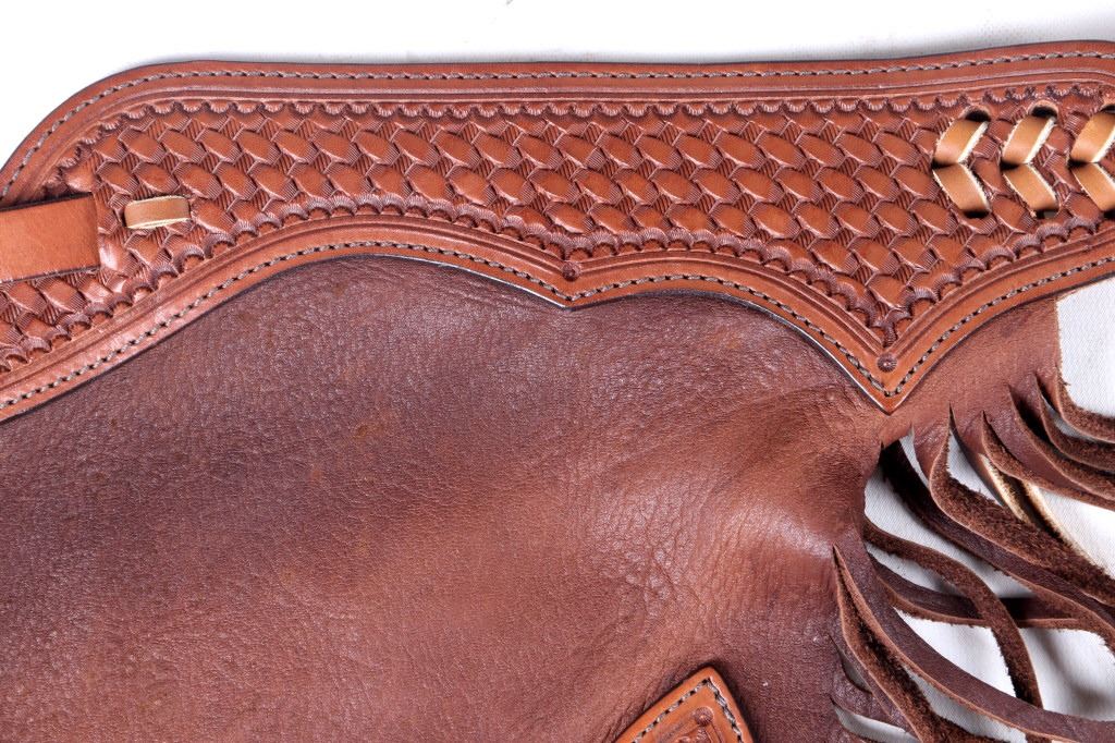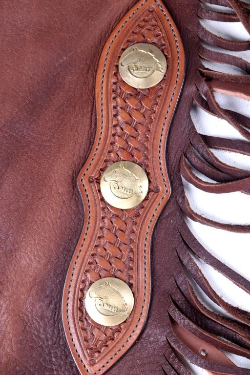 For your consideration, a pair of rare Parelli Collection elk hide chinks chaps. These beautiful chaps are of very supple soft elk hide in a gorgeous cocoa-brown. The fringed chaps are trimmed with a tooled leather yoke and brass buckles. The tooled leather overlay on each leg is accented with brass conchos struck with the Parelli horse head logo. In the center of the tooled yoke is another Parelli logo that reads, "Parelli Collection". The chaps measure 38" from buckle to tip of belt,